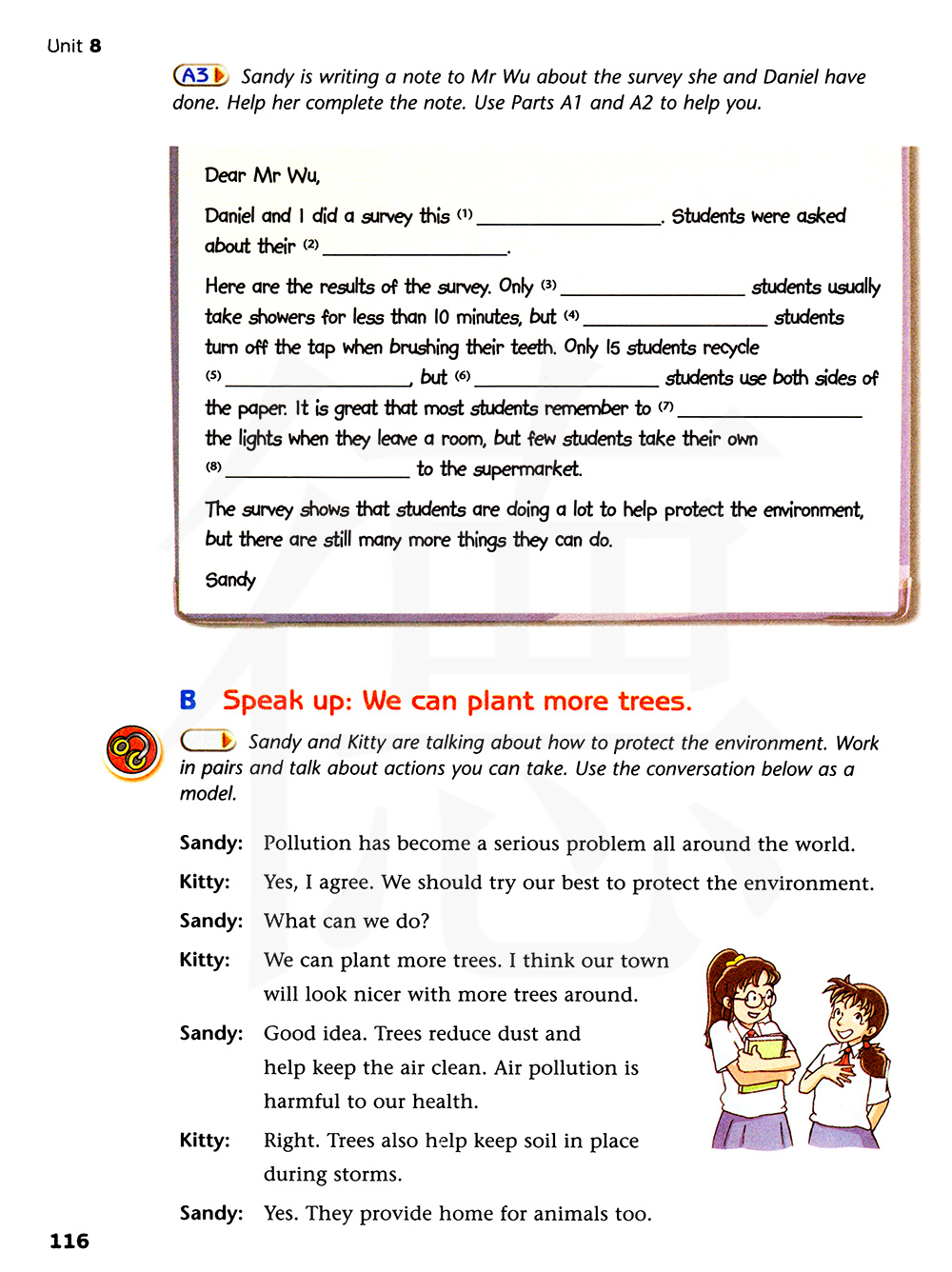 三第和基蒂正在谈论如何保护环境。两个人一组并谈论你能采取的行动,用下面的对话作为一个人模板。