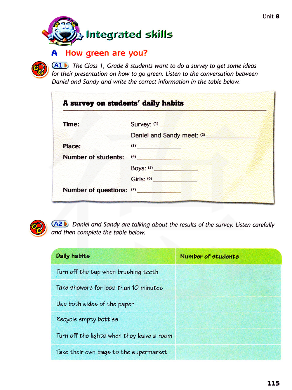 八年级一班的学生想要为他们关于如何保护环境的演出做一个调查。听丹尼尔和桑迪的对话并在下面的表格写上正确的信息。