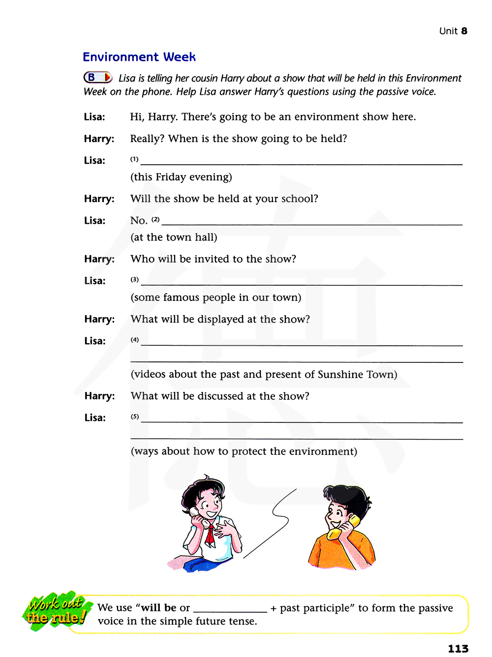 丽萨再打电话告诉他的表弟哈利关于一场将要在这个环境周举行的展示。帮助丽萨使用被动语态回答哈利的问题。