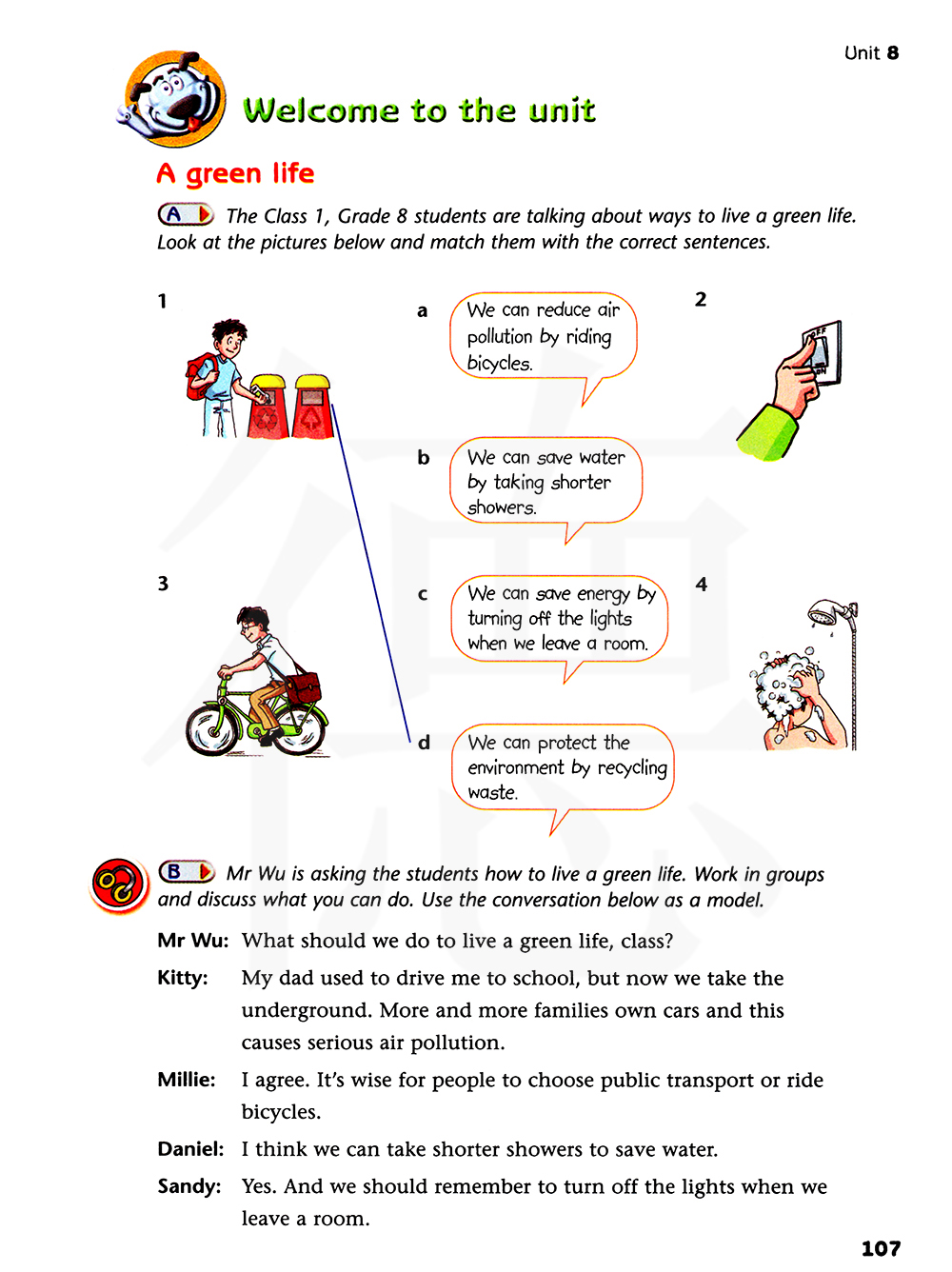 八年级一班的学生正在谈论过上绿色生活的方法。看下面的图片并把它们跟正确的句子匹配。