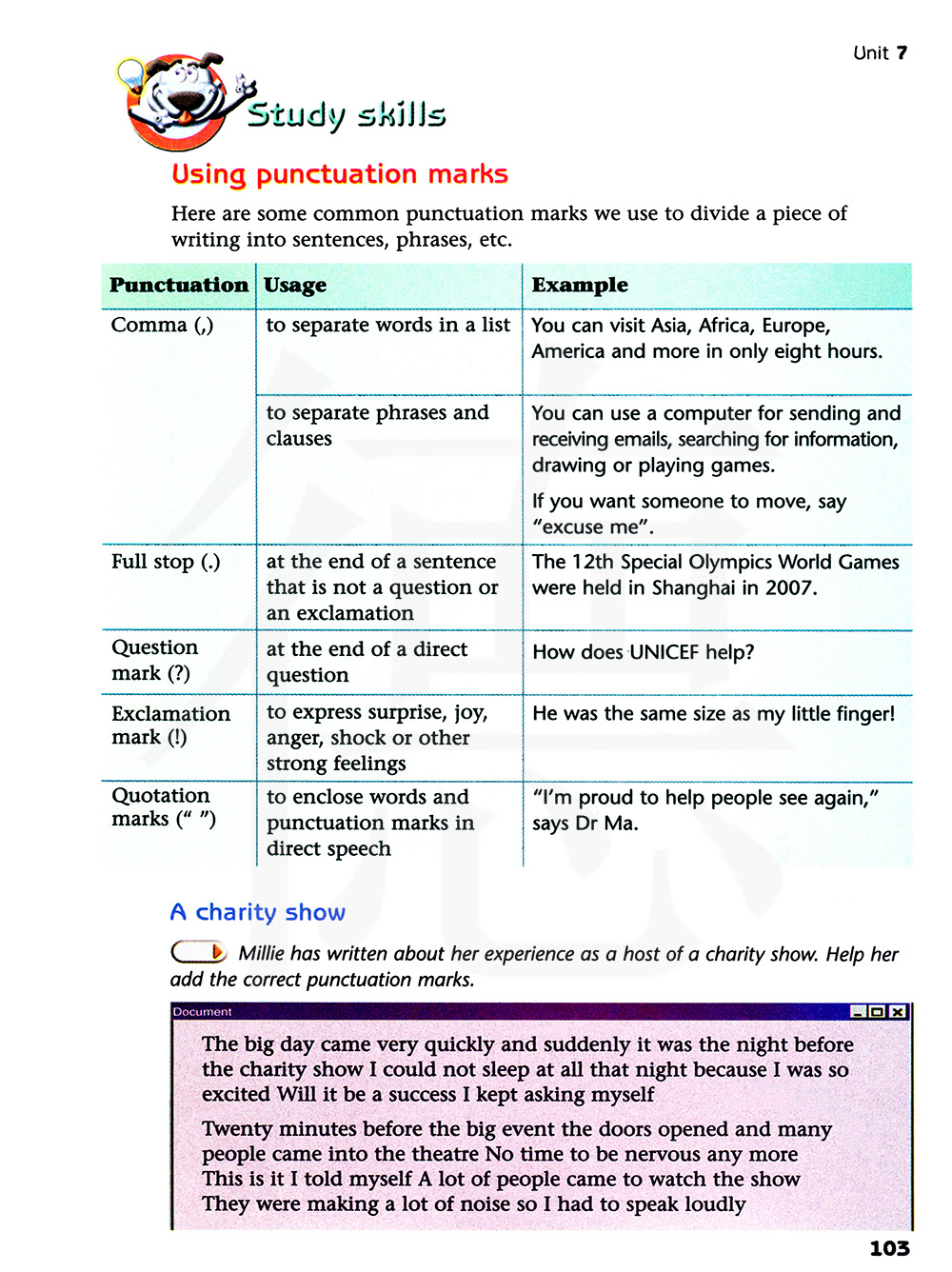 米莉已经写了他作为一场慈善演出的主持的经历。帮助他加上正确的标点符号。