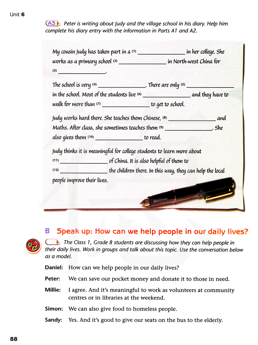 八年级一班的学生正在讨论他们怎样才能在日常生活中帮助人们。以小组为单位并讨论这个话题。用下面的对话作为一个模板。