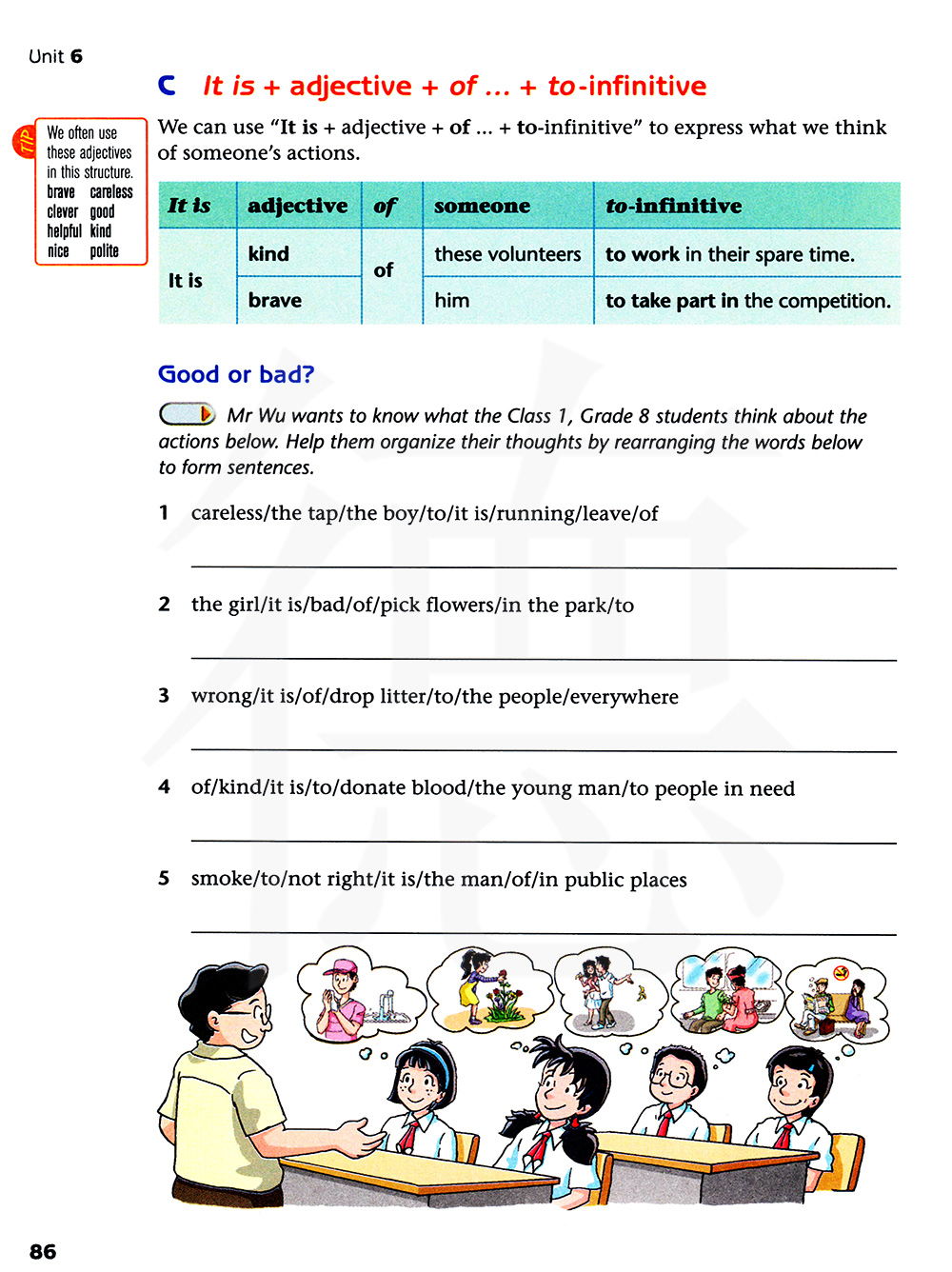 吴老师想知道八年级一班的的学生对下面的行为的看法。帮助他们把下面的单词重组成句子来组织他们的想法。