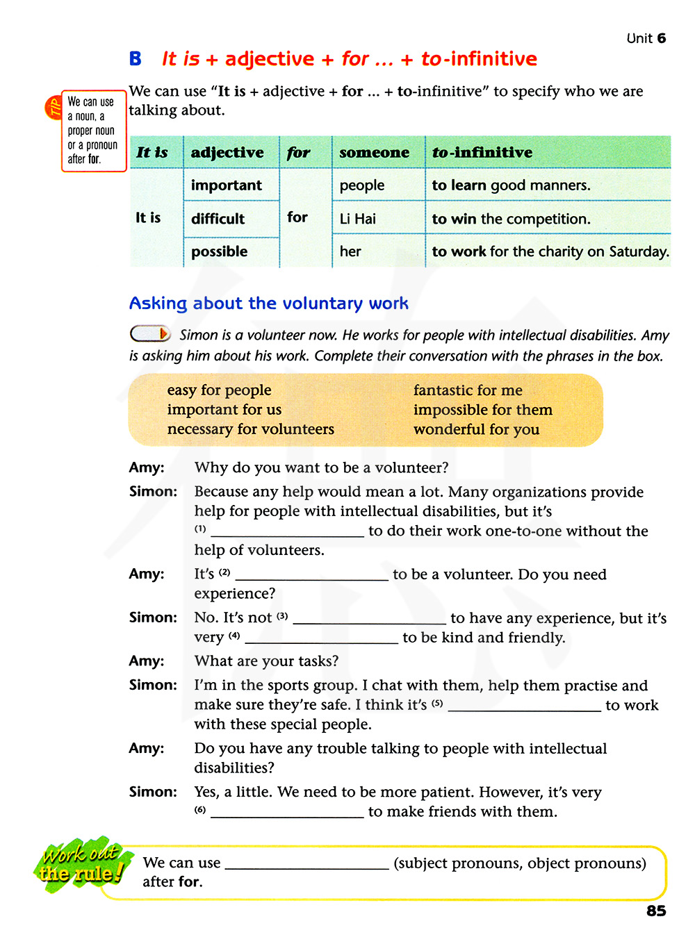 西蒙现在是一名志愿者。他为了有智力缺陷的人而工作。用方框里的短语完成它们的对话。