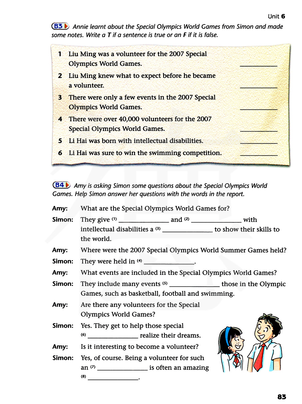 艾米正在问西蒙一些关于特奥会的事。用报告里的单词帮助西蒙回答她的问题。