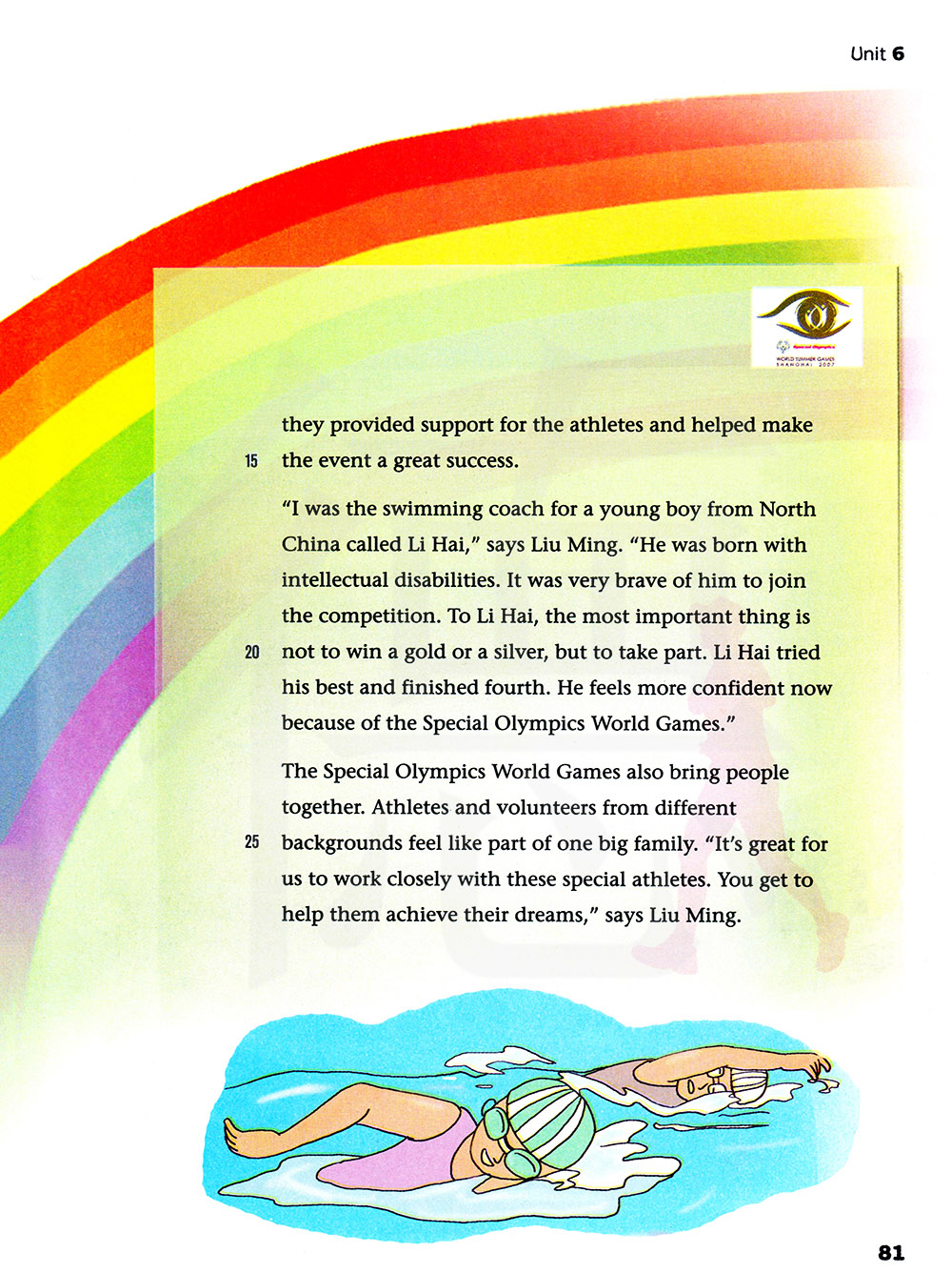 “我给一位来自华北的名叫李海的小男孩当游泳教练,”刘明说。“他生下来就有智力缺陷。他来参加比赛非常勇敢。对李海来说,最重要的事不是赢得金牌或银牌,而是参与。李海尽了最大努力并取得第四名。因为特奥会,他现在更加自信了。”