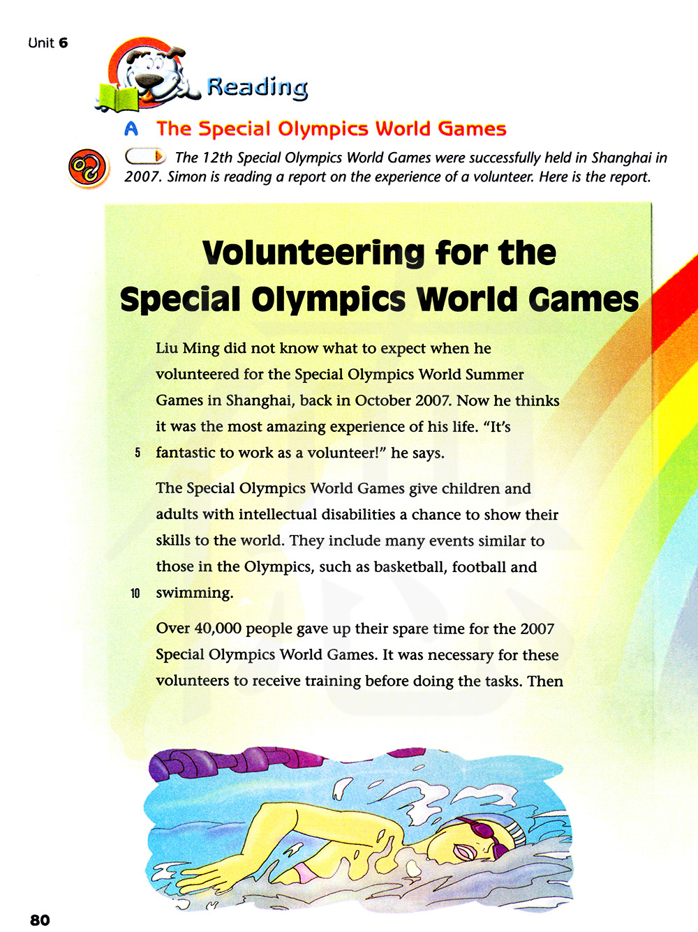 在2007年,第十二届奥运会成功在上海举办。西蒙在阅读一份关于一位志愿者经历的报告。这里是那份报告。