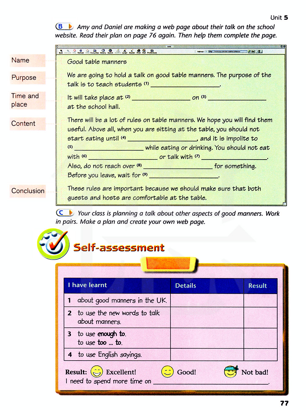 艾米和丹尼尔正在学校网站做一个关于他们的演讲的网页。再读一次76页他们的计划。然后帮他们完成网页。