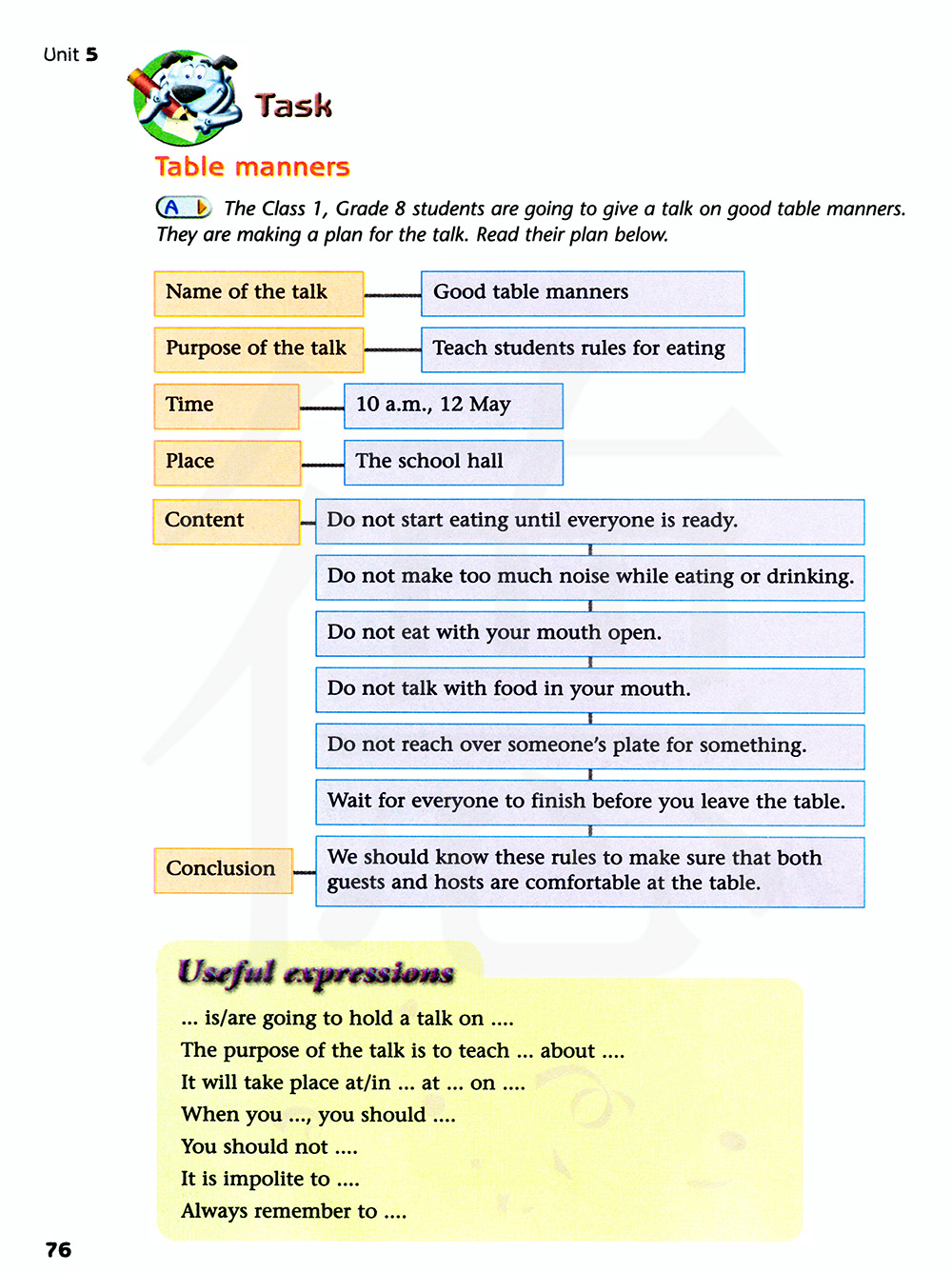 八年级一班的学生将要做一个关于餐桌礼仪的讲稿。他们正在为演讲做计划。阅读下面他们的计划。