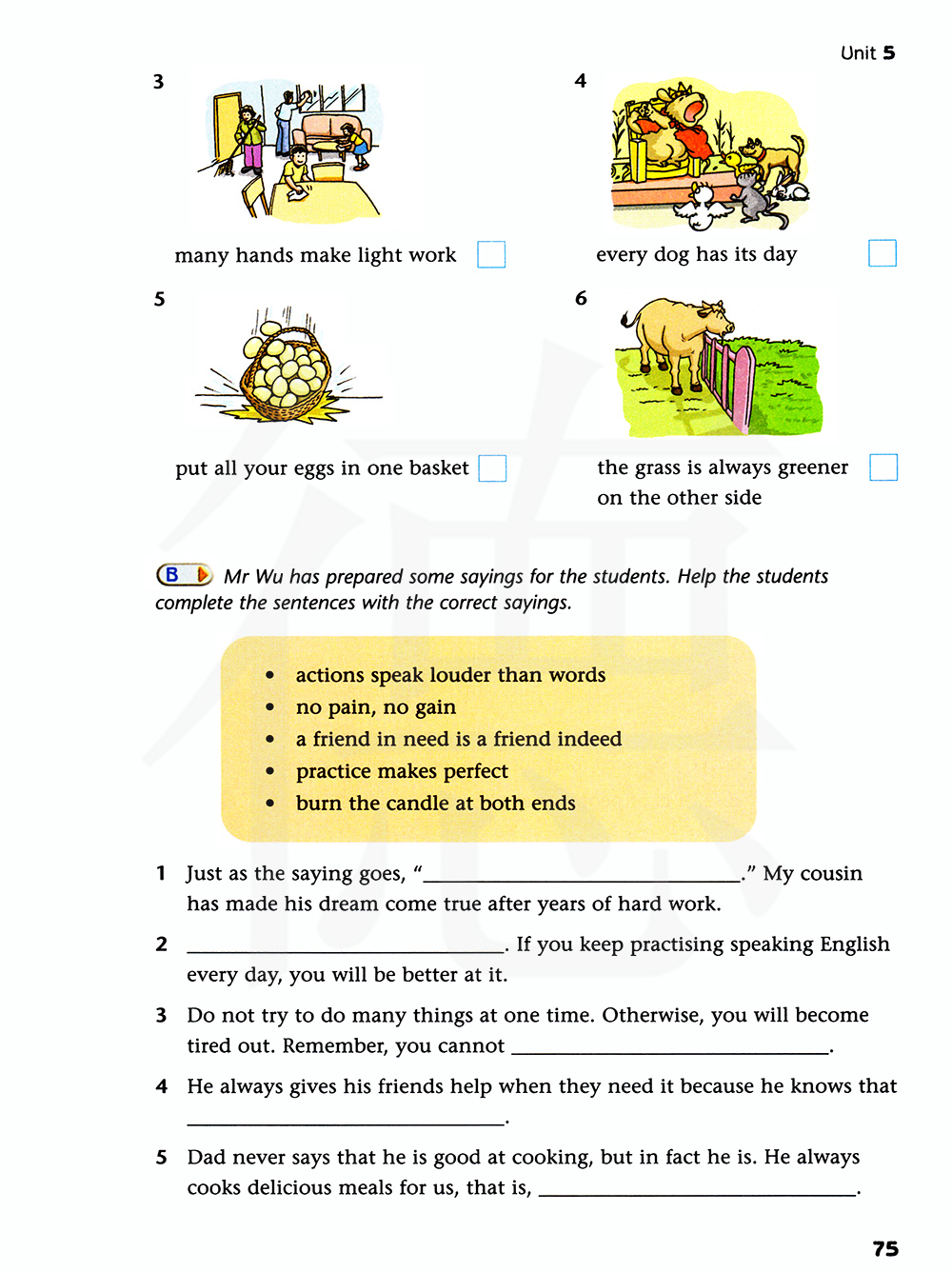 吴老师为学生准备了一些谚语。帮助学生用正确的谚语完成句子。