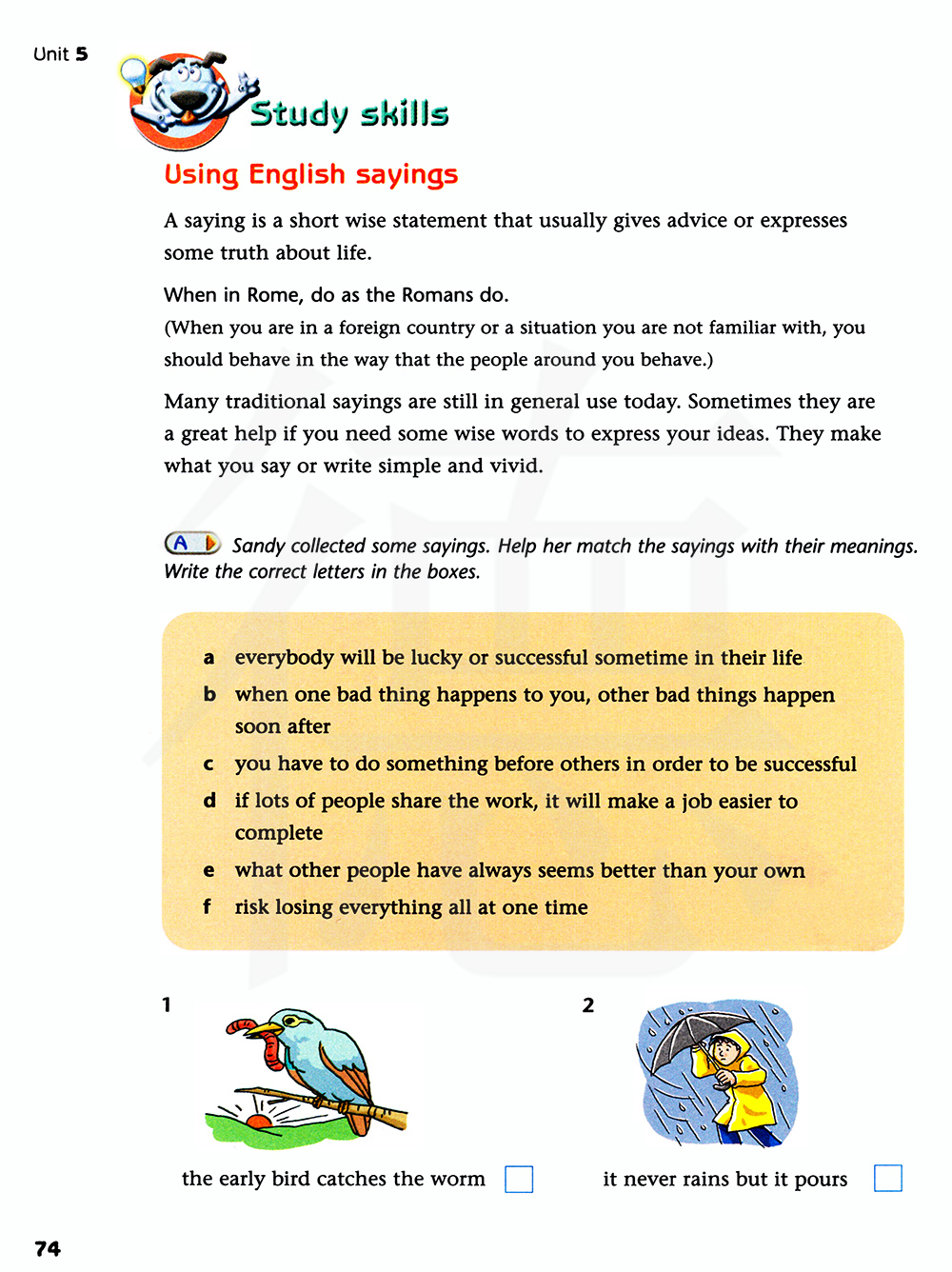 桑迪收集了一些谚语。帮助她把谚语跟它们的意思配对。在方框里写上正确的字母。