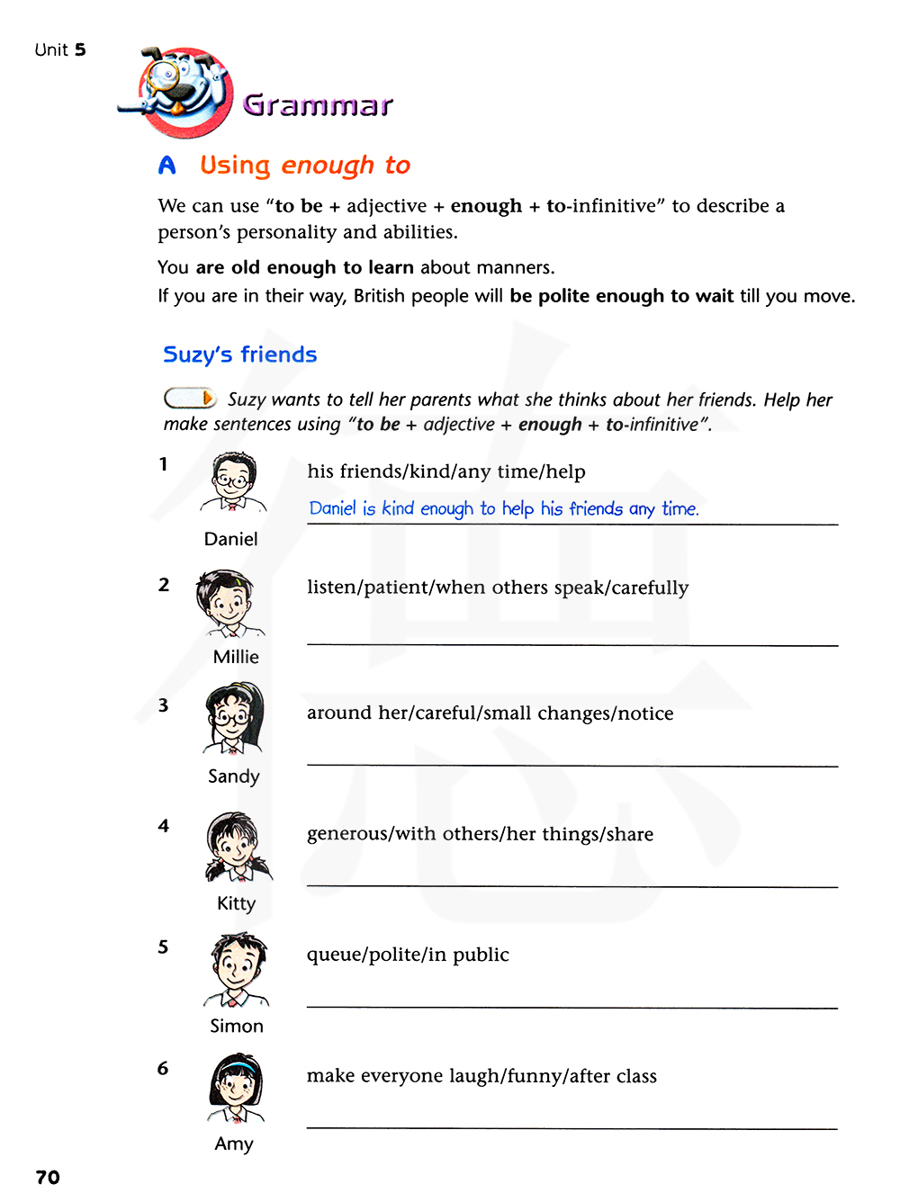 苏西想告诉他的父母它是如何看待她的朋友的。用to be+形容词+enough+to不定式来帮助她完成句子。
