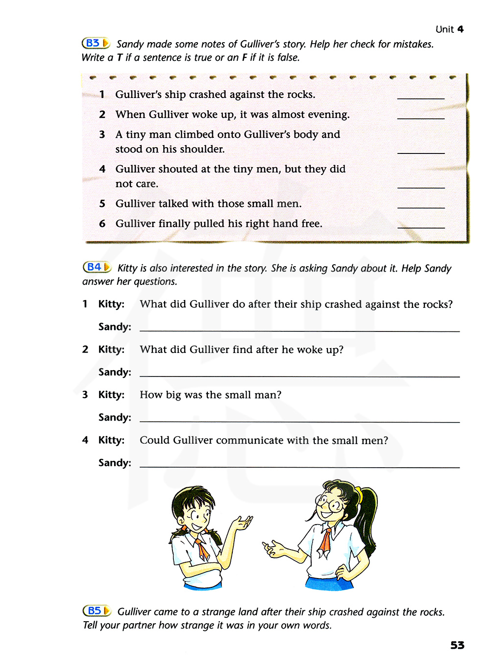 丧地做了一些笔记,笔记是关于格利佛的故事的。帮助她检查错误。如果句子是正确的,写上T,如果句子是错误的,写上F.