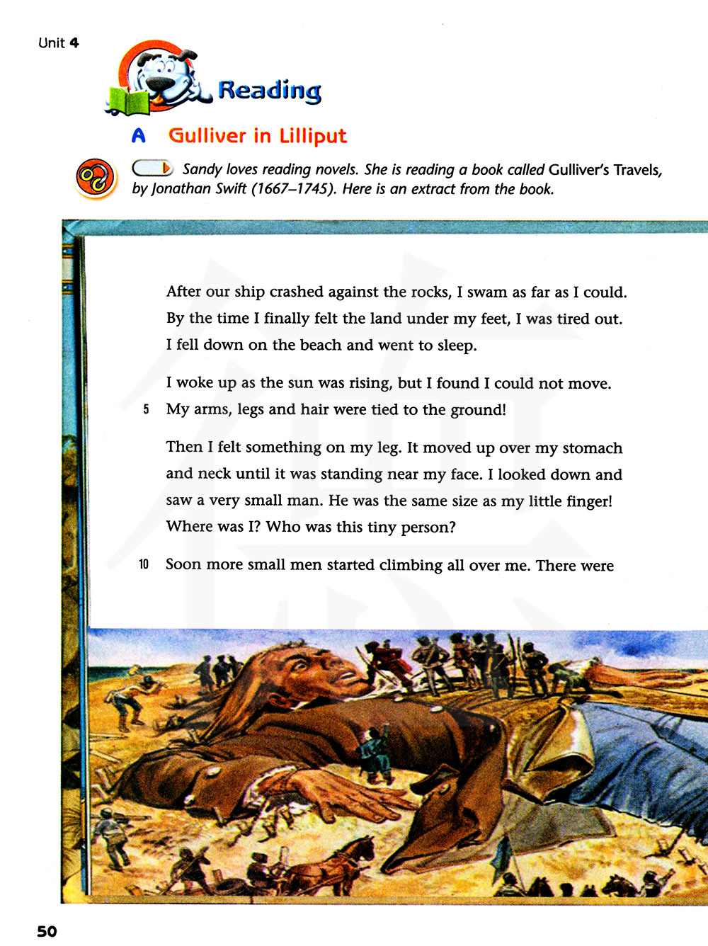 桑迪喜欢看小说。他在看一本关于乔纳森.斯威夫特(1667-1745)写的,名字叫做《格里利佛游记》的小说。这里的文章选自那本书。