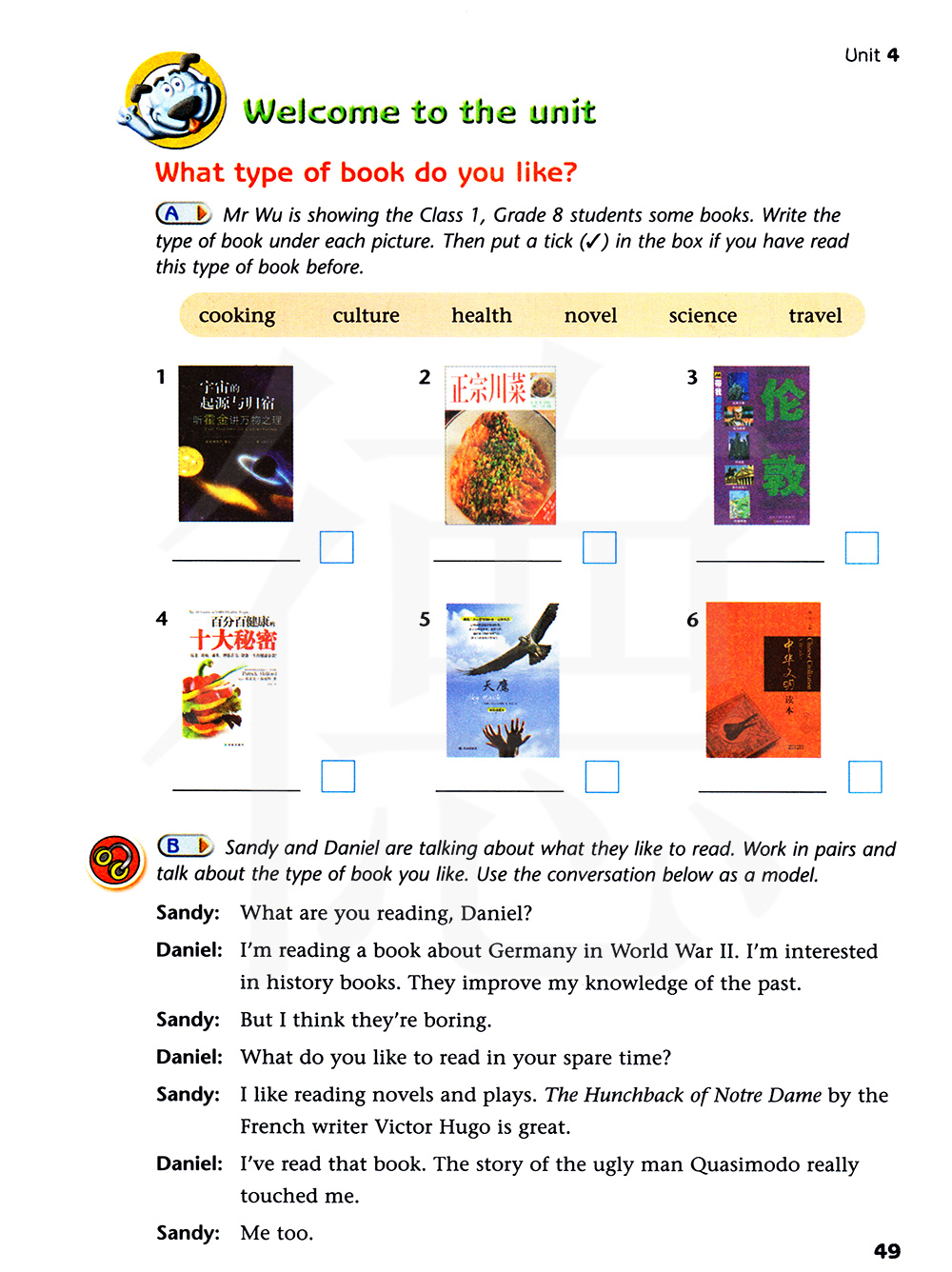 吴老师在给八年级一班的学生看一些书。在每幅图下面写上书的类型。如果你已经读过这一类型的书,那么打上一个勾。