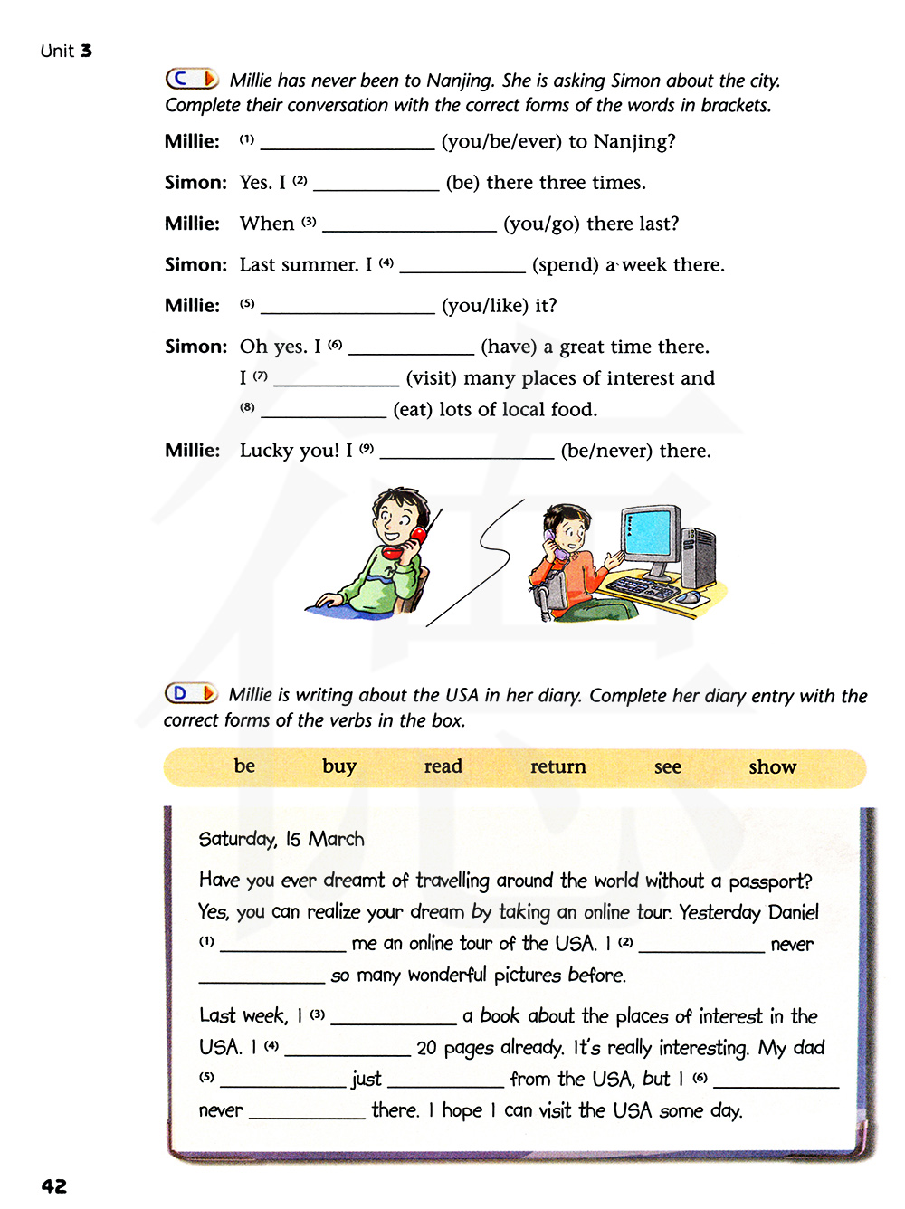 米莉从未去过南京。她在问西蒙关于这个城市的事。用括号里的单词的正确形式完成它们的对话。