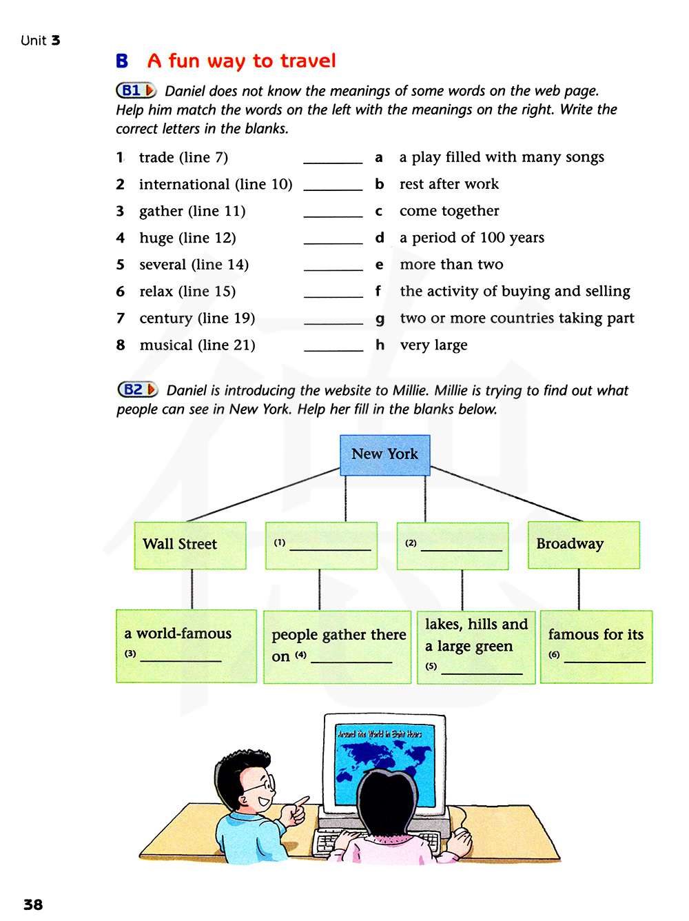 丹尼尔不认识网页上的某些单词的意思。帮助他把左边的单词跟右边的意思相配,在空白处写上正确的字母。