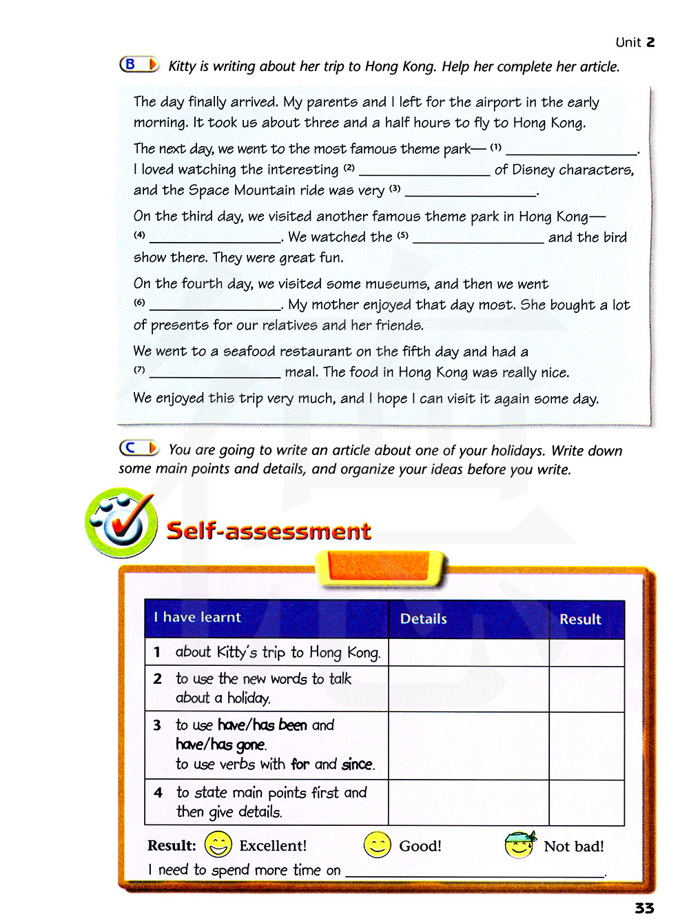 基蒂在写她的香港之旅。帮助她完成她的文章。