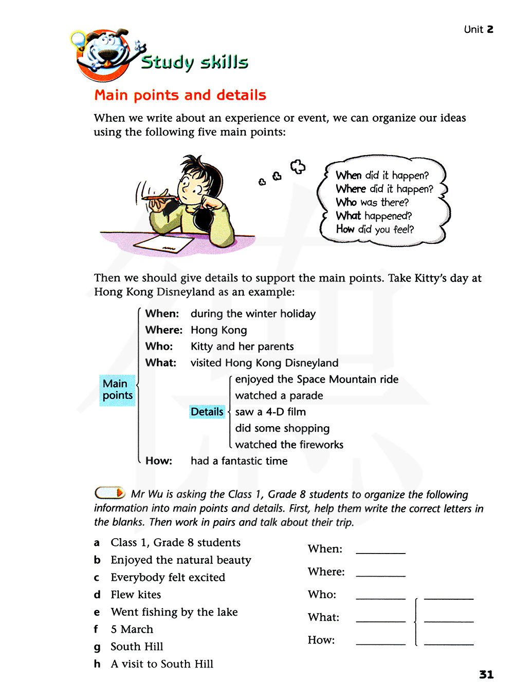 然后我们要提供细节来支持这些要点:以基蒂在香港迪士尼乐园的一天作为模型: