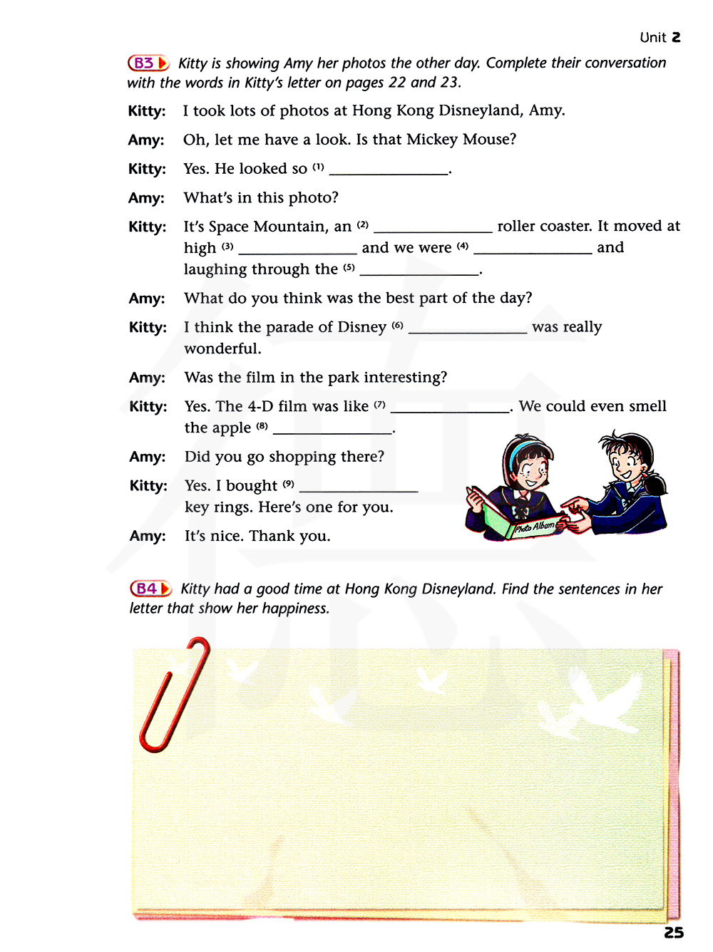 第二天,基蒂给艾米看她的照片。用第22页和第23页的基蒂的信里面的单词来完成它们的对话。