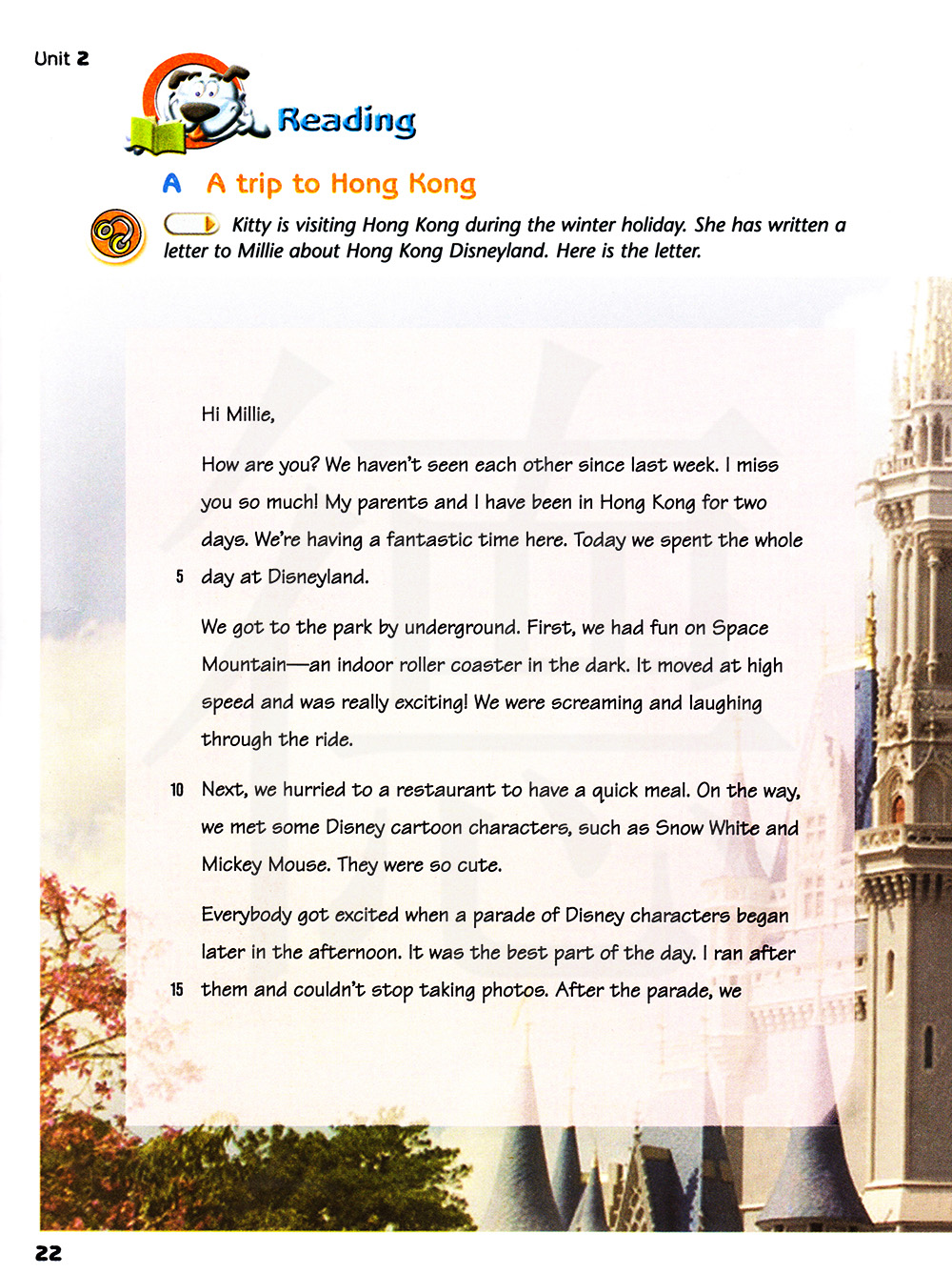 基蒂在寒假期间游览香港。他已经写了一封信告诉米莉关于香港的迪士尼乐园。这是那封信。