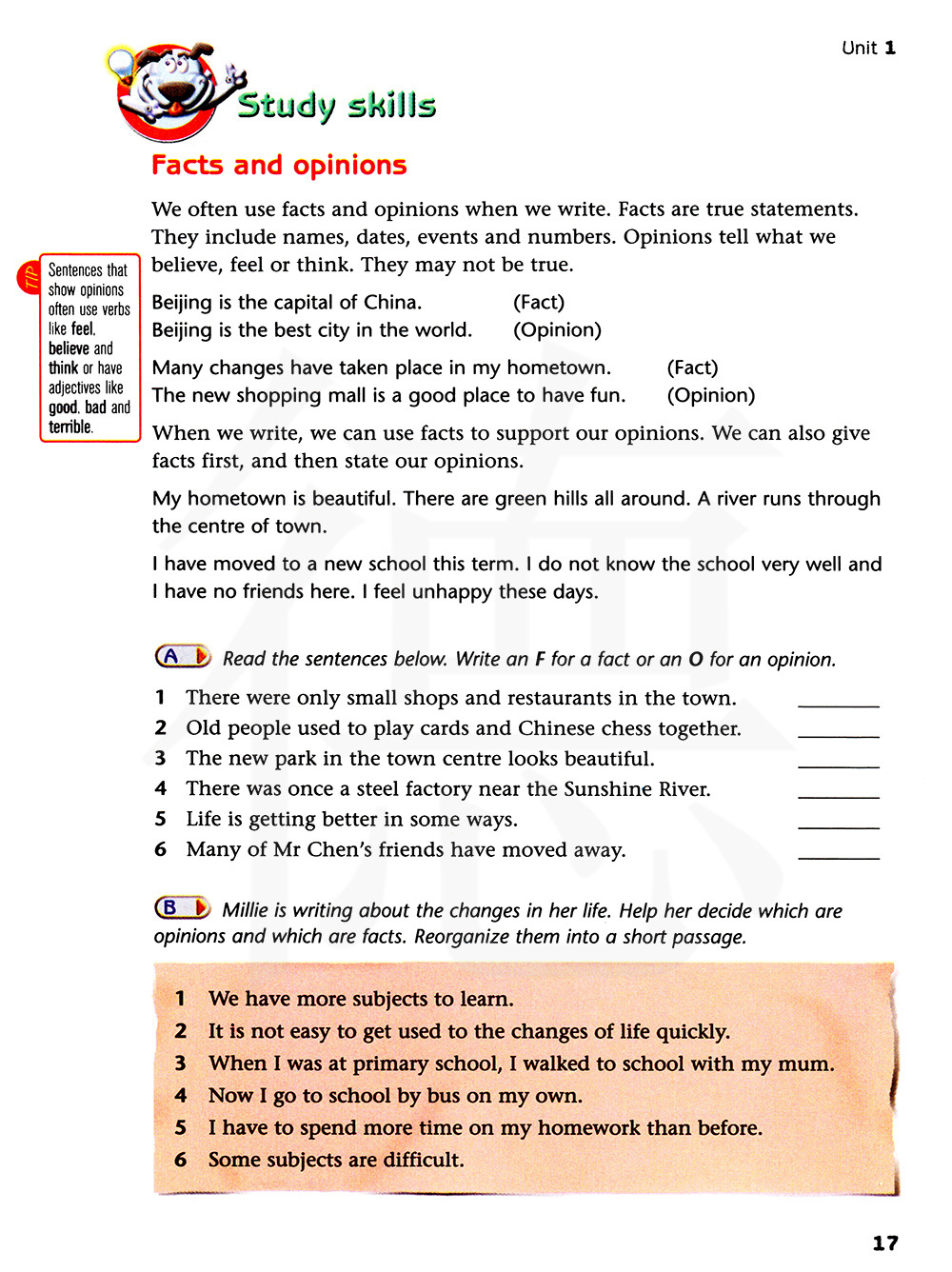 它们包括名字,日期,时间么和数字。观点讲述的是我们所相信的事,所感觉的事或者所认为的事。它们也许不是真的。