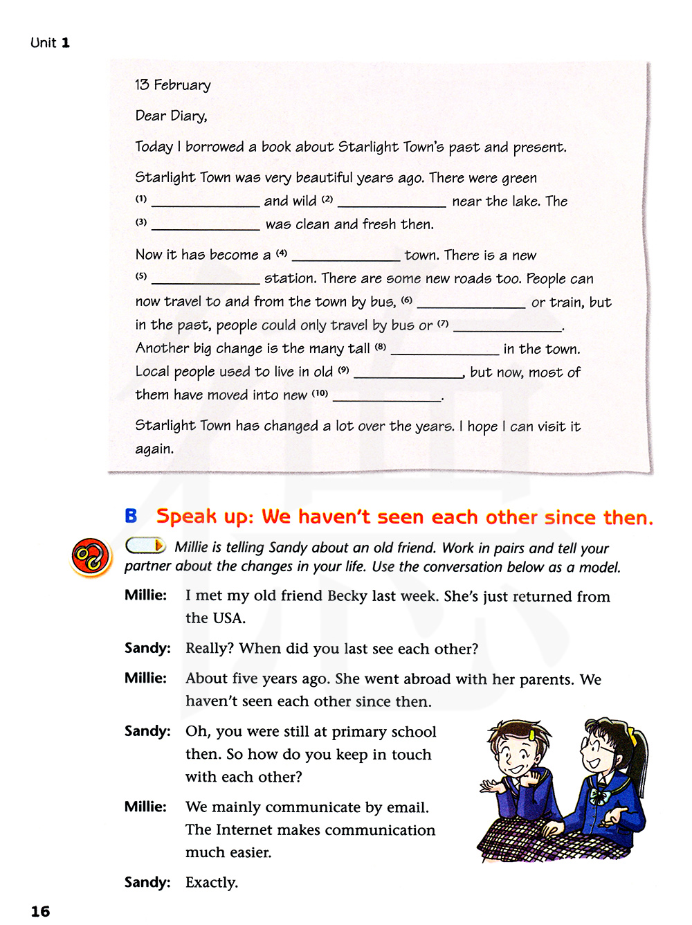 迷离正在告诉桑迪关于一位老朋友的事。两个人一组并告诉你的搭档关于你生活里的变化。用下面的对话作为一个模型。