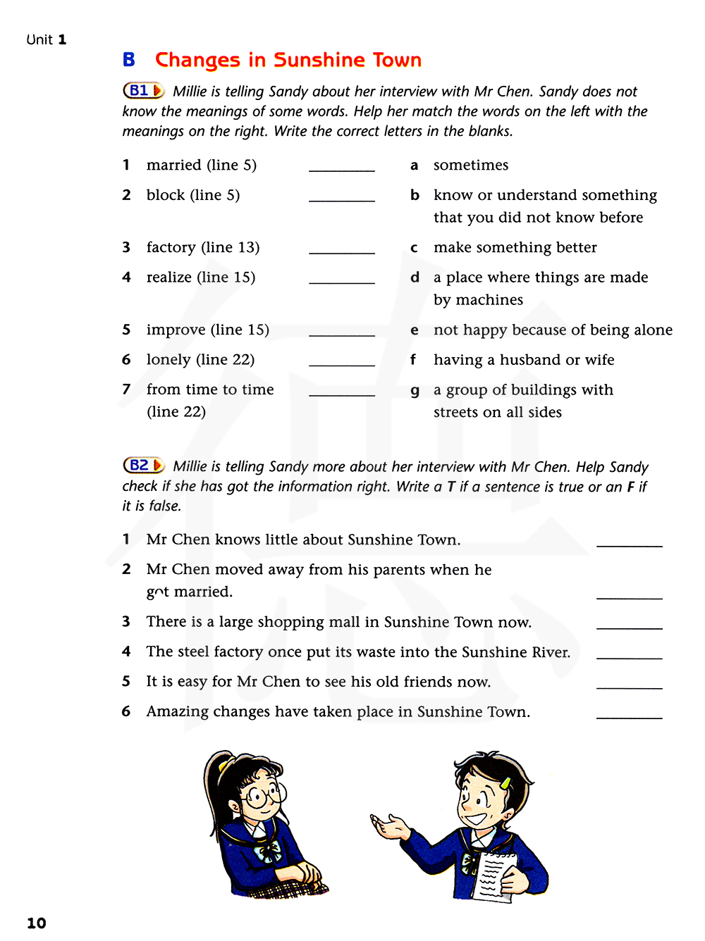 米莉正在告诉桑迪关于她对陈先生的采访。桑迪不知道某些单词的意思。帮助他把左边的单词和右边的意思配对,在空白处写上正确的字母。