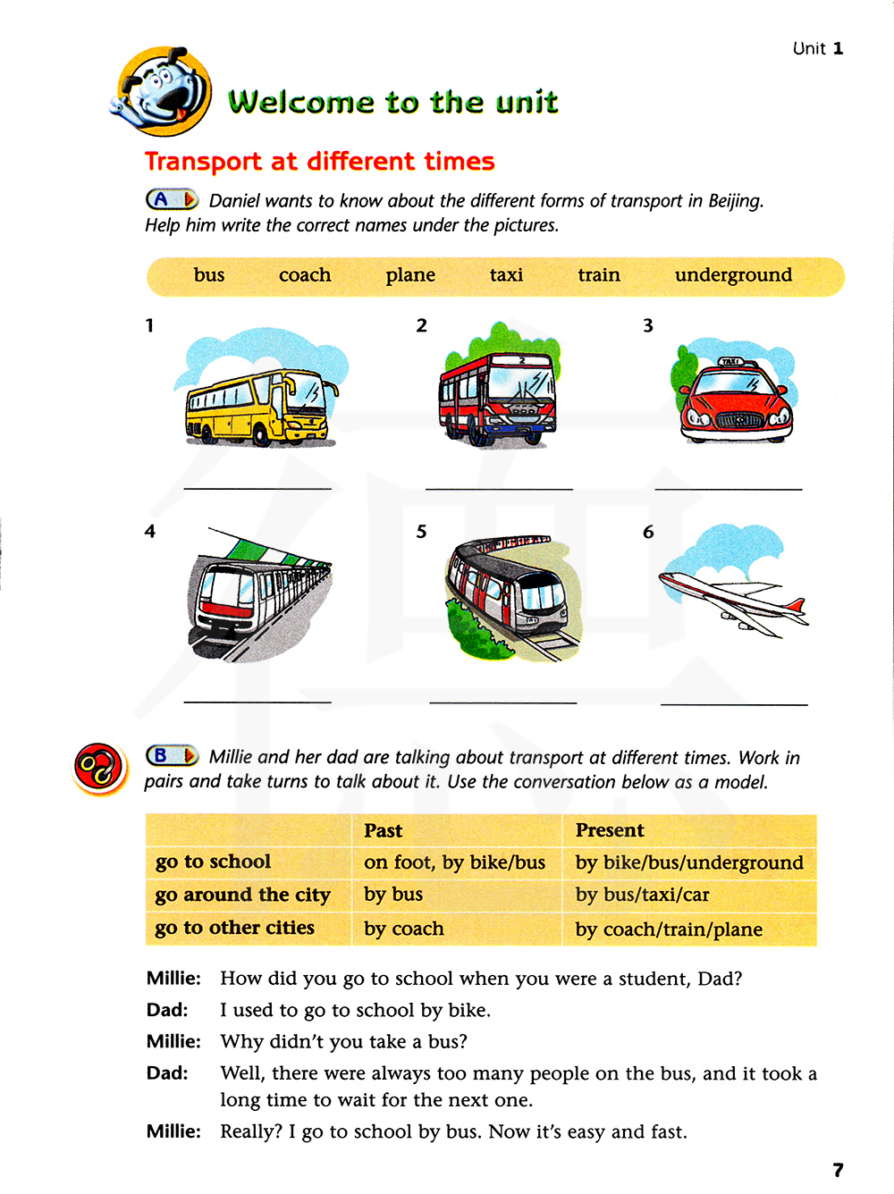 米莉和他的爸爸正在谈论不同时期的交通。两人一组轮流谈论它,用下面的对话作为一个模型。