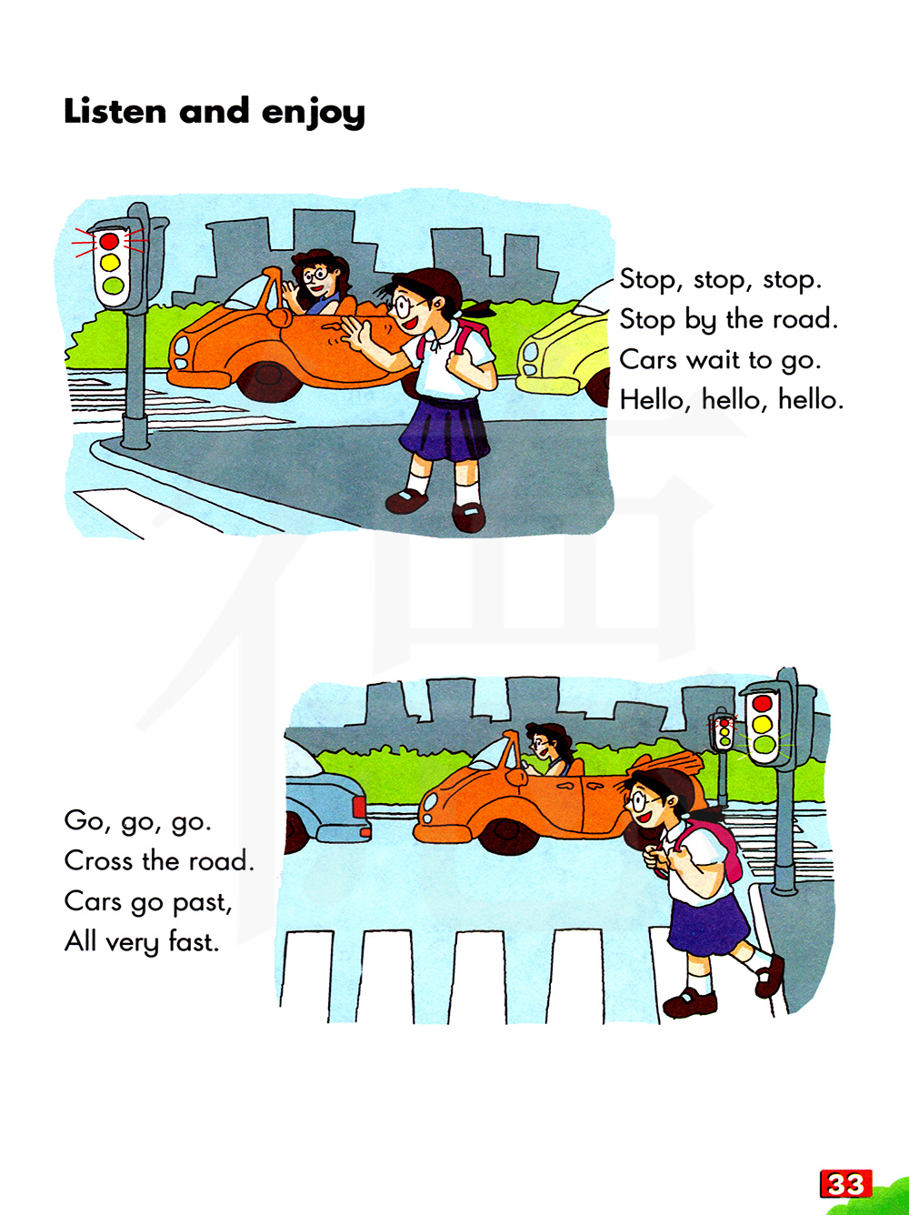 停,停,停。停在路边。小汽车等着前进。你好,你好,你好。