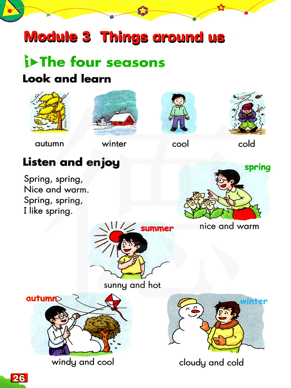 autumn 秋天 winter 冬天 c ool 凉爽的 cold 寒冷的