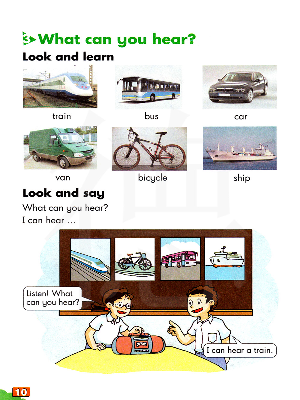 train 火车 bus 公共汽车 car 小汽车 van 货车 bicycle 自行车ship 船