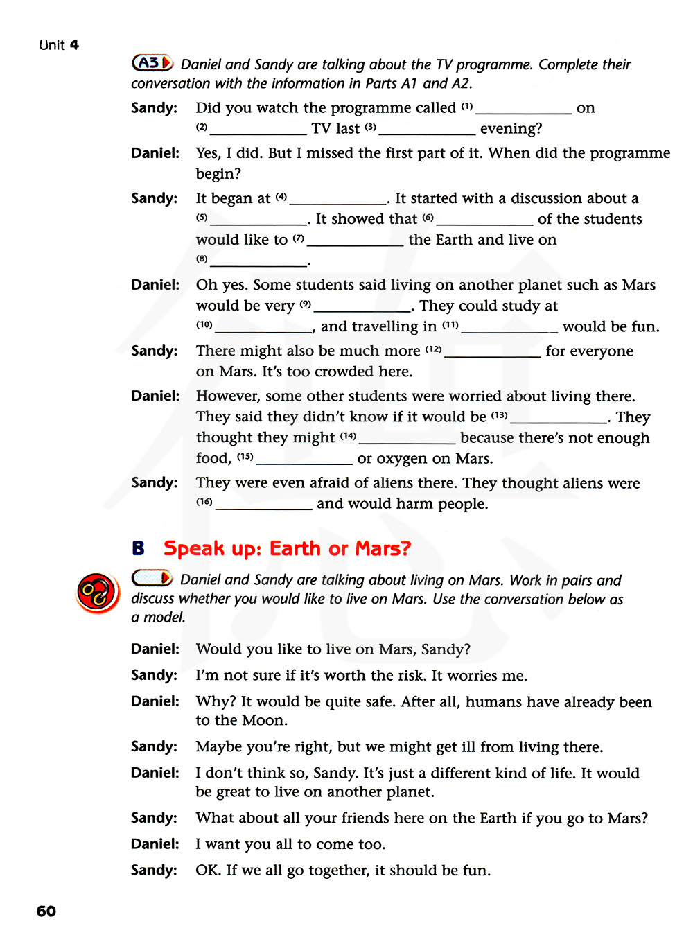 丹尼尔和桑迪正在谈论火星上的生活。结对练习并讨论你们是否想去火星上生活。以下面的对话为例。