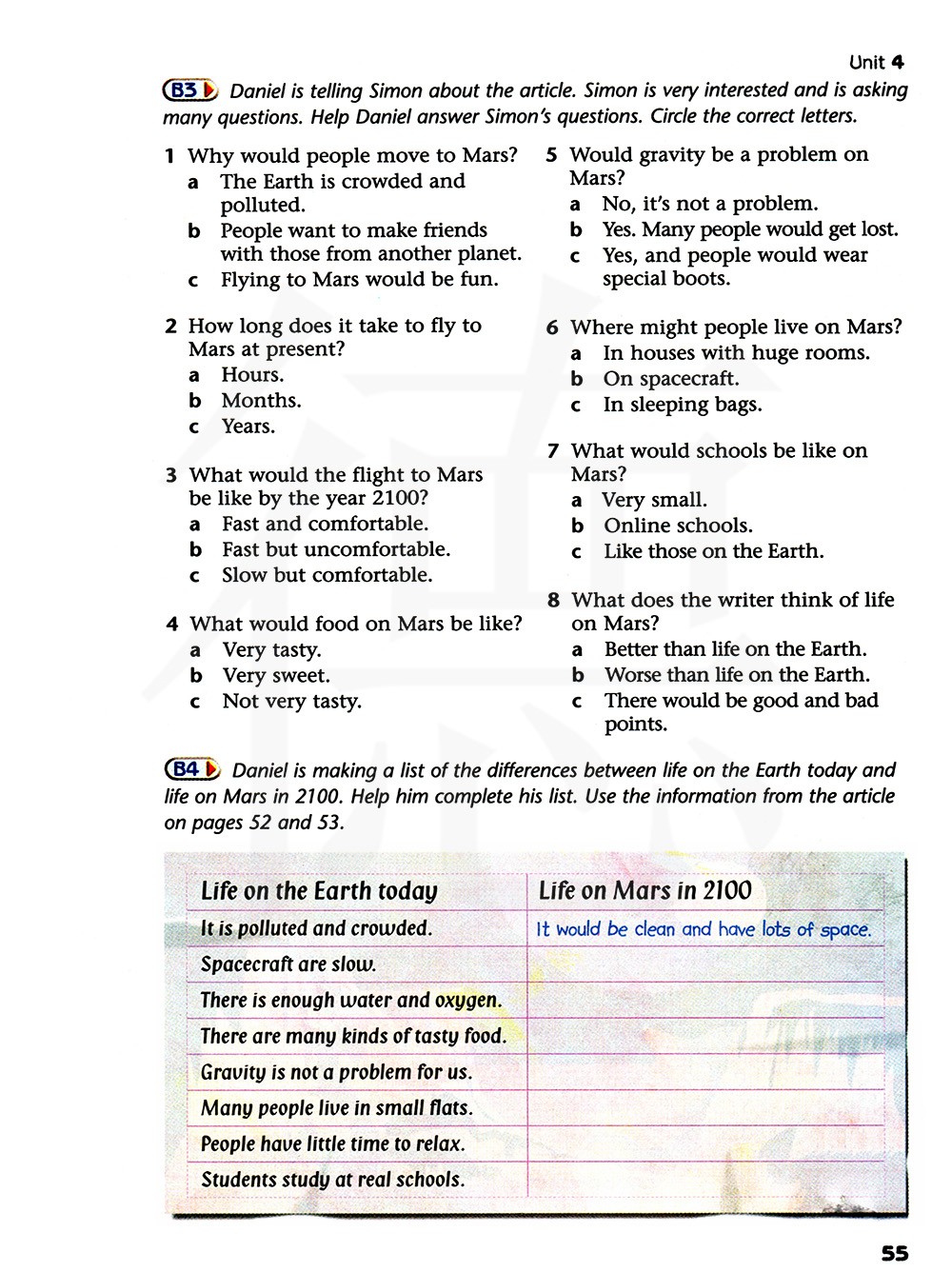 丹尼尔在制作一份现在地球上的生活与2100年火星上的生活之间的差异列表。帮他完成列表。使用52和53页文章中的信息帮助你。