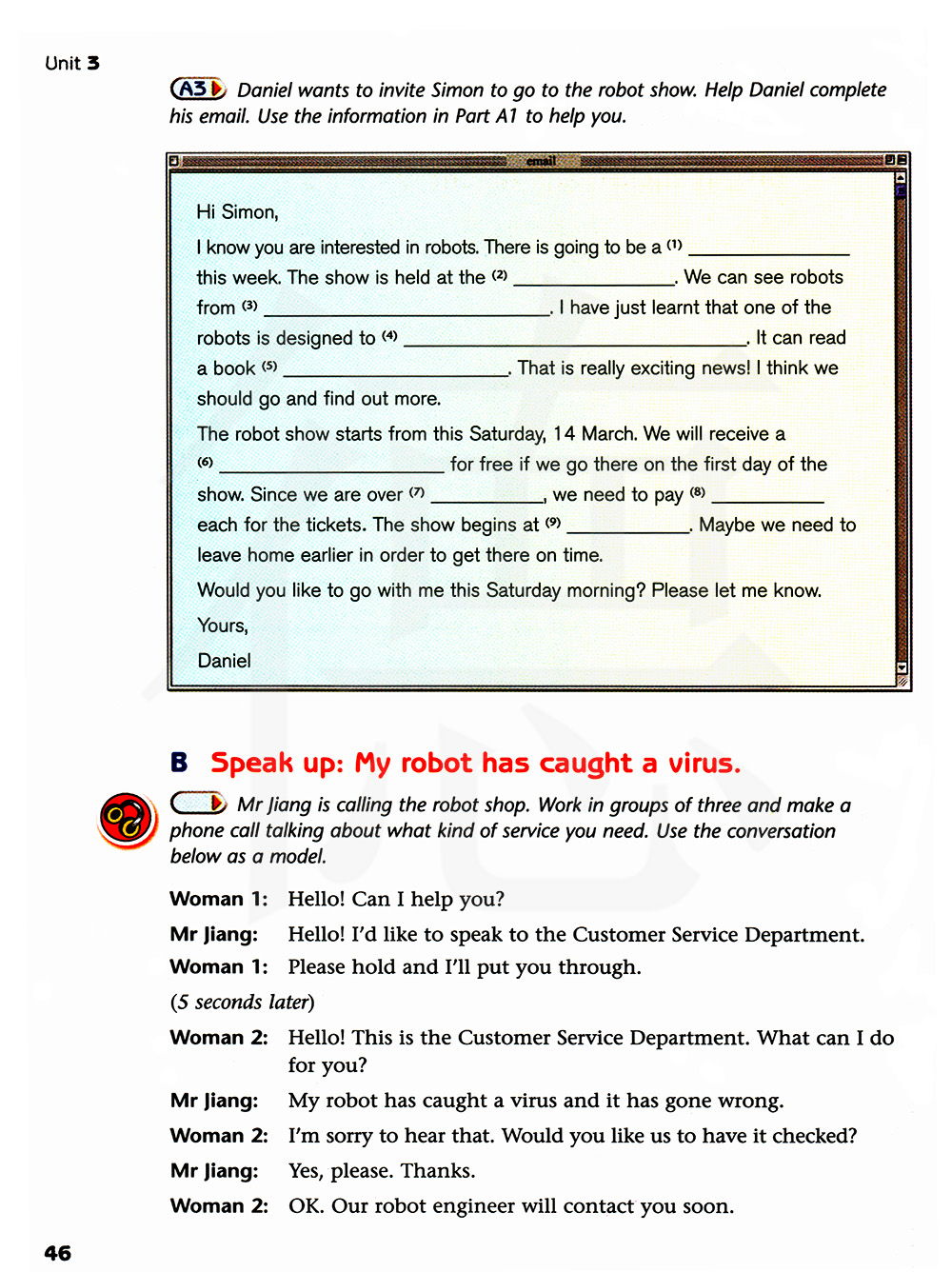 丹尼尔想邀请西蒙一起去看机器人展看会。帮丹尼尔完成他的文章。使用A1部分的信息帮助你。