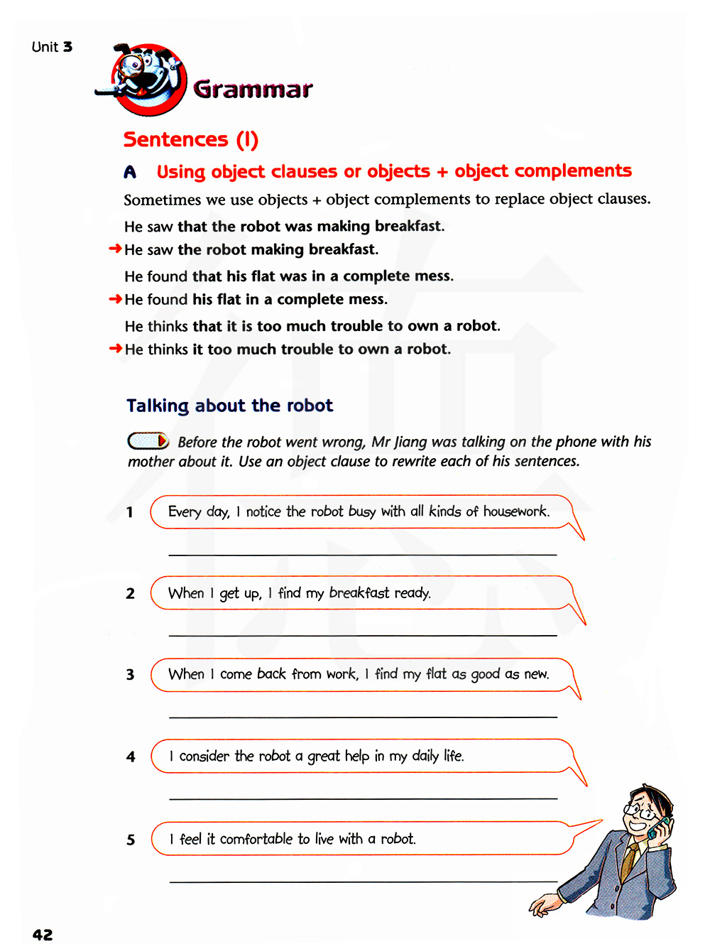 在机器人出问题之前,江先生再给他妈妈打电话谈论机器人.用宾语从句改写他的句子.