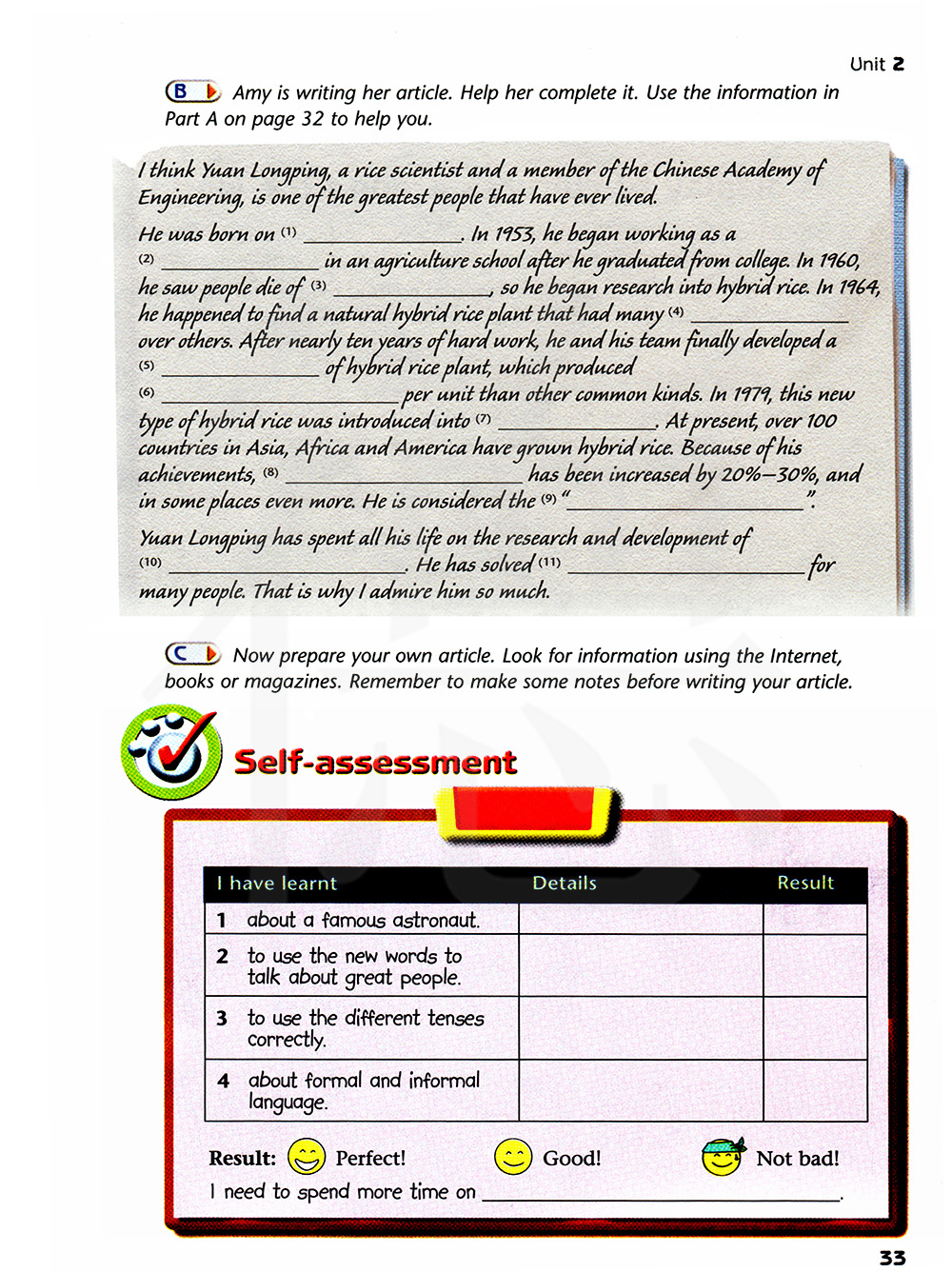 艾米在写文章,帮他完成。使用32页A部分的信息帮助你。