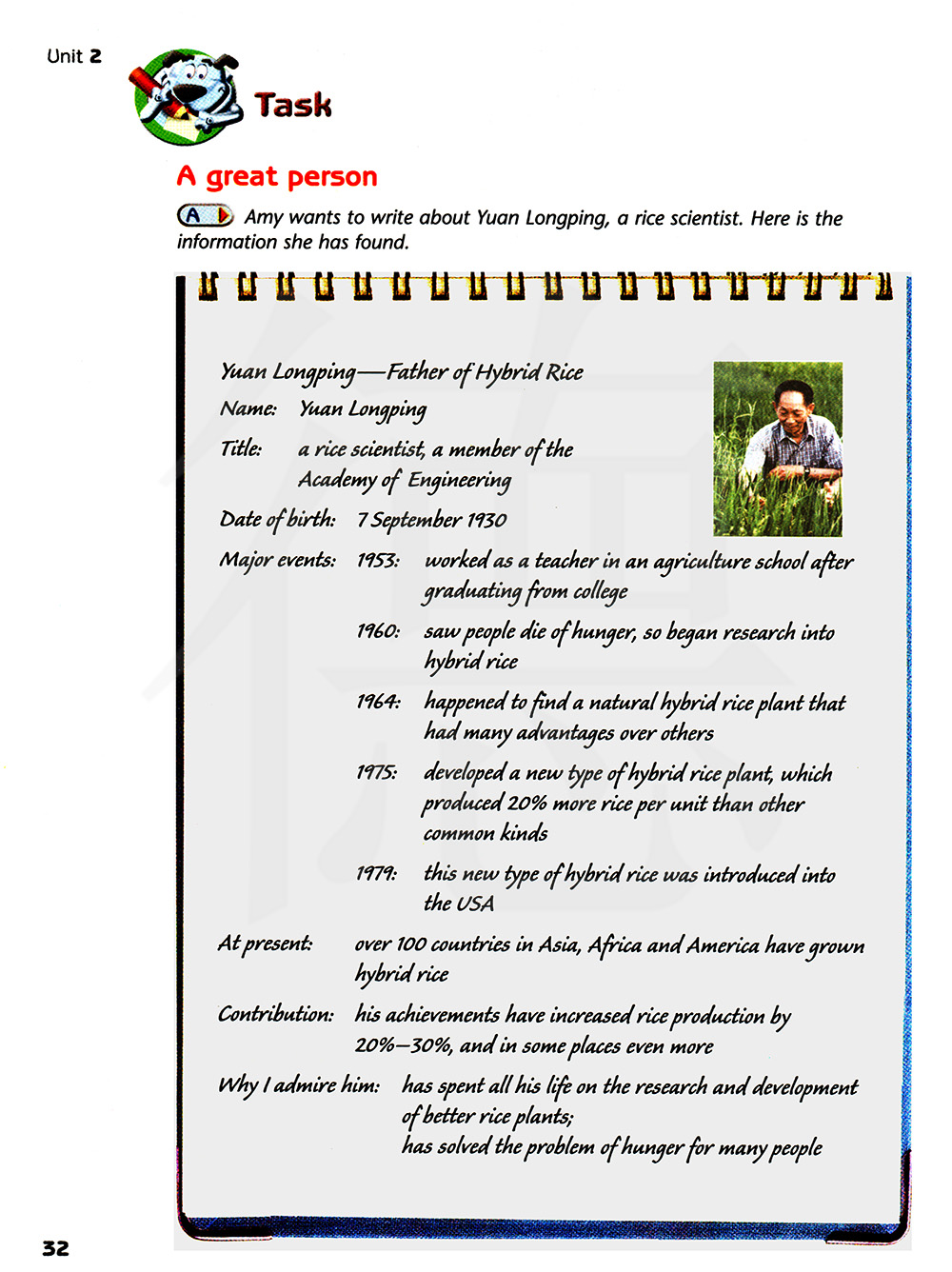艾米想写关于一名水稻科学家——袁隆平的事迹。这里是他找到的信息。