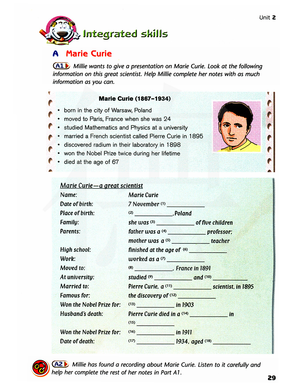 迷离找到了一段关于玛丽.居里的录音。认真听并帮他完成A1部分剩下的笔记。