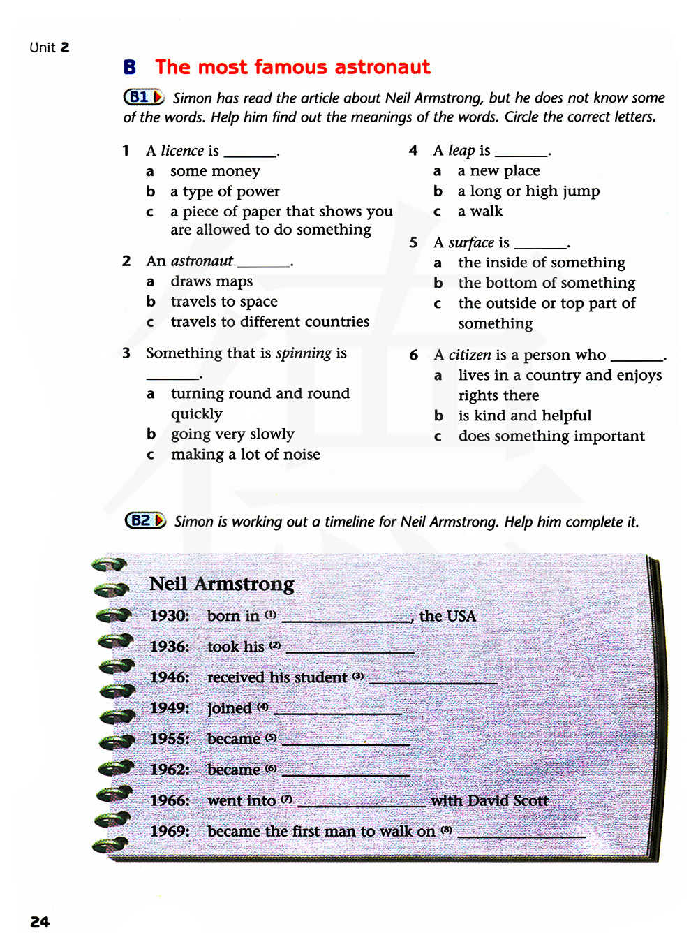 西蒙已经阅读了关于尼尔.阿姆斯特朗的文章,但是有些单词他不认识。帮他找出这些单词的意思。圈出正确的字母。