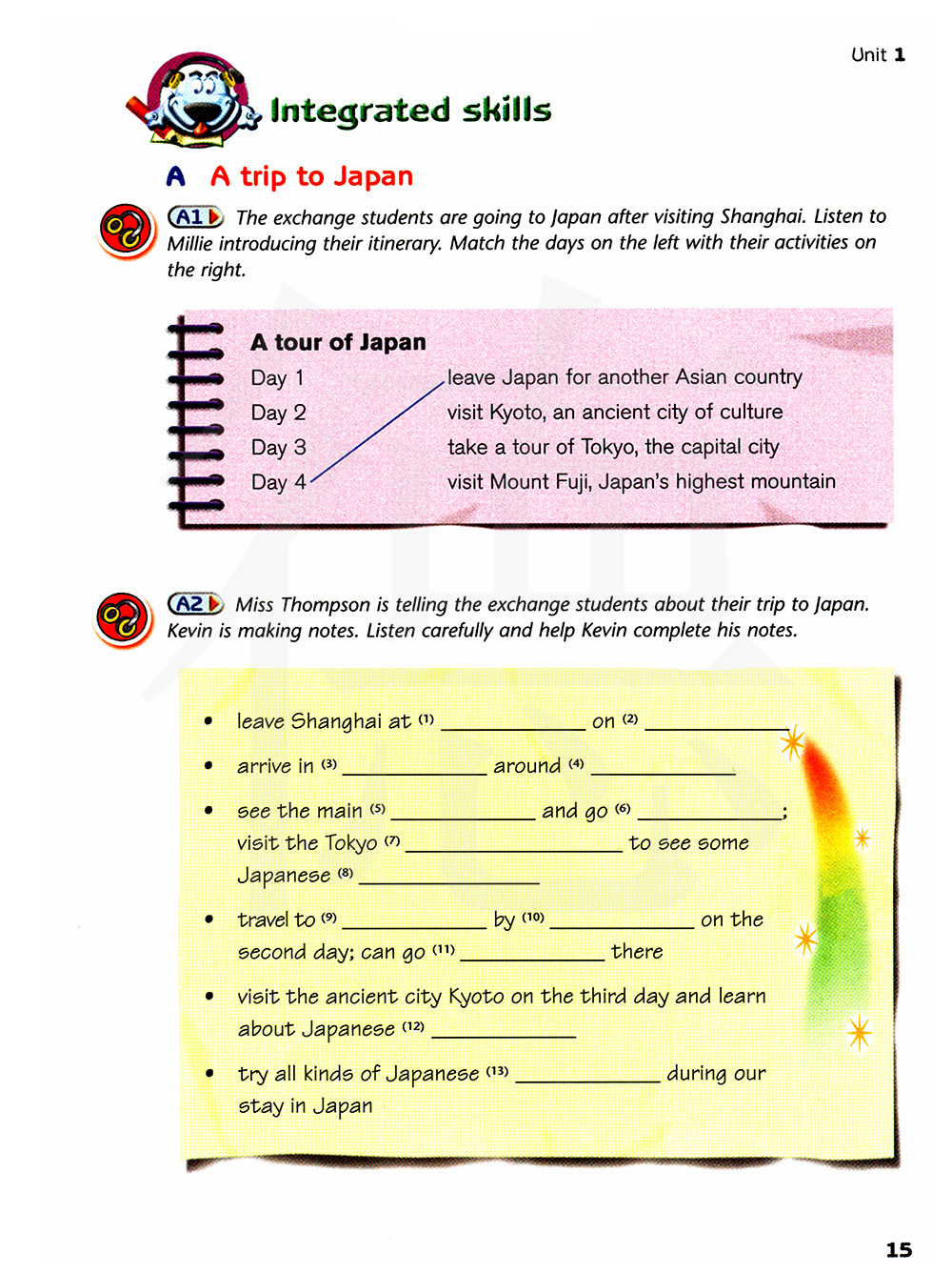 汤姆生小姐在给交换生讲述关于它们的日本之旅。凯文在做笔记。认真听一听并帮助凯文完成她的笔记。
