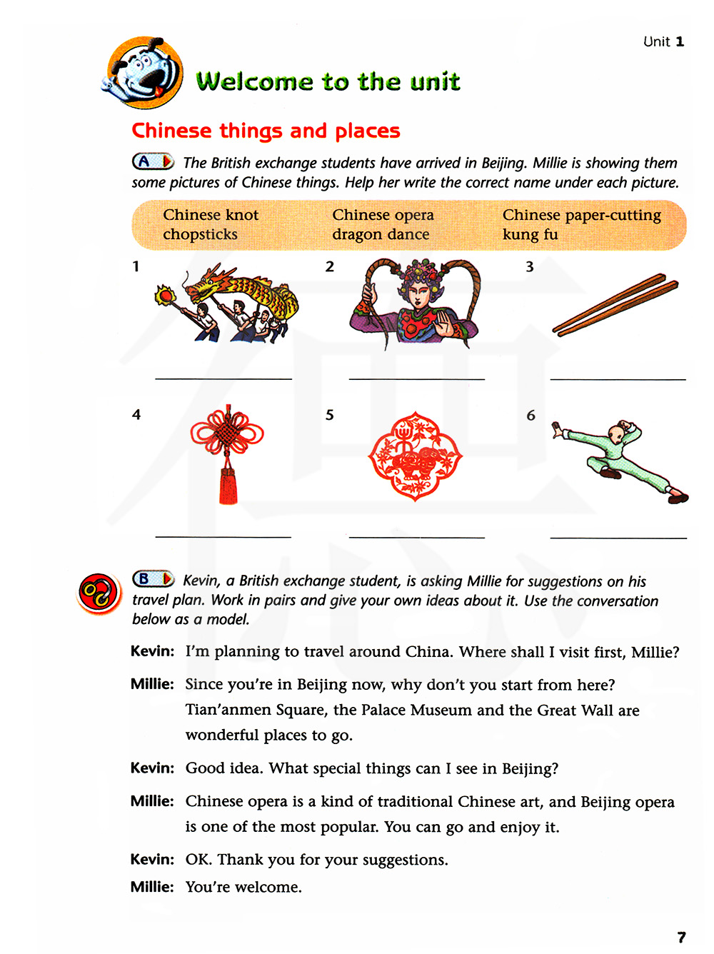 英国交换生已经抵达北京。米莉给他们看了一些关于中国事物的图片。帮他在每张图片下面写上正确的名称。