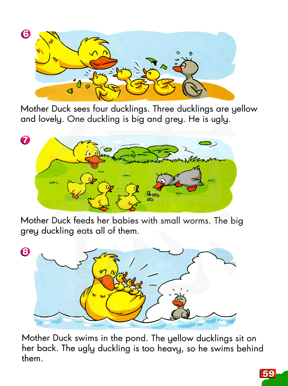 鸭子妈妈看见四只小鸭子。三只小鸭子是黄色的,很可爱。一只小鸭子是大大的,是灰色的。他很丑。