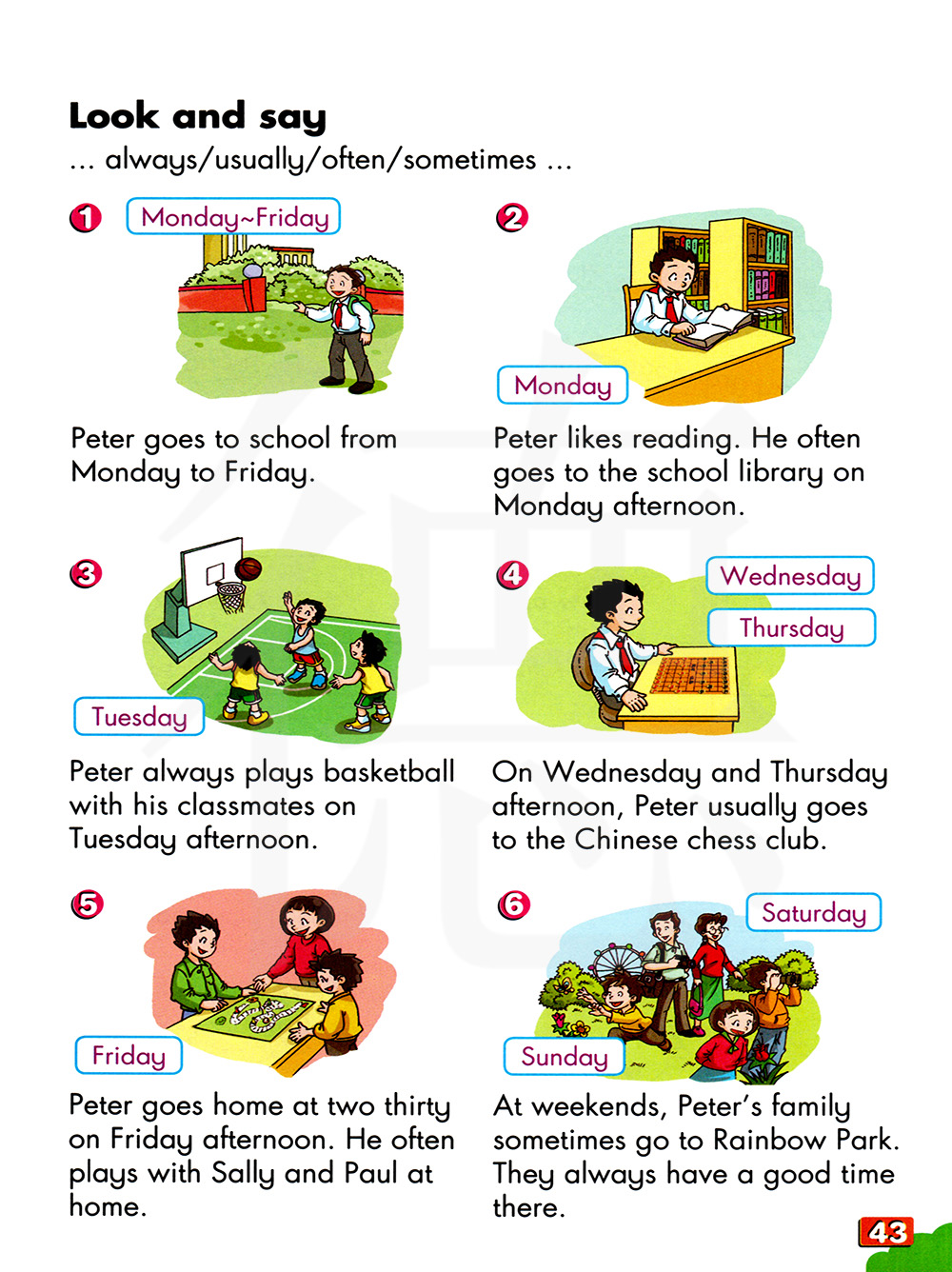 彼得喜欢阅读。他经常在星期一下午去学校图书馆。