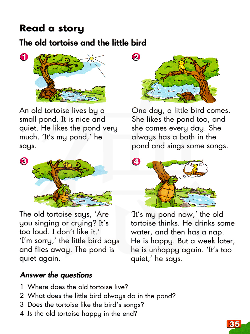 3 乌龟喜欢这只鸟儿唱的歌吗? 4 最后,老乌龟开心了吗?