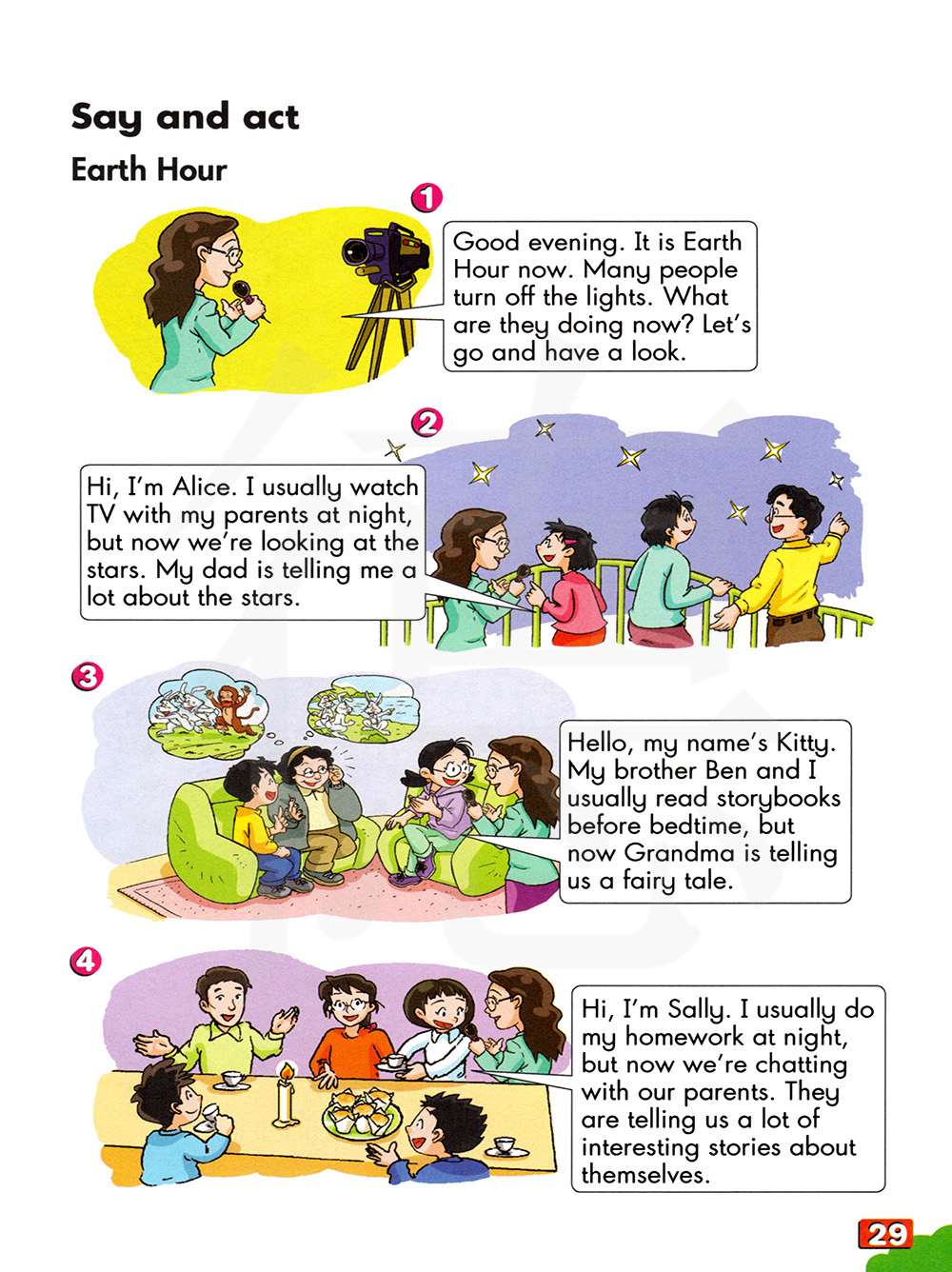 嗨,我是萨利。我通常在晚上做我的家庭作业,但是现在,我们正在和父母聊天。他们正告诉我们很多关于他们自己的有趣的故事。