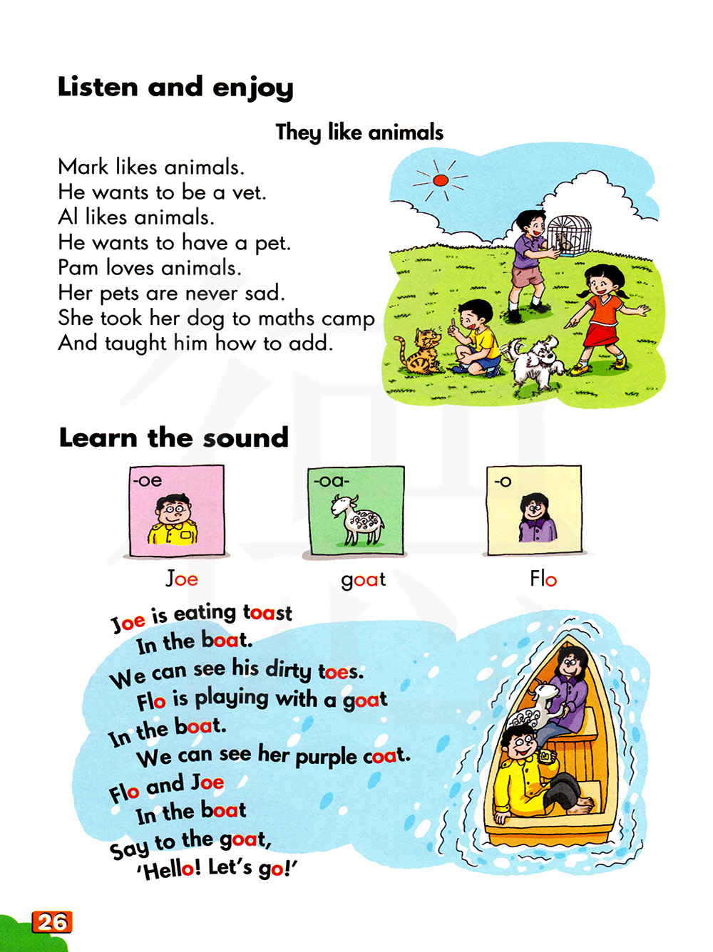 乔正在船上吃烤面包。我们能看到他的脏脚趾。弗洛正在船上与一只山羊玩耍。我们能看见她的紫色外套。弗洛和乔正在船上对山羊说:“你好!我们走吧!”