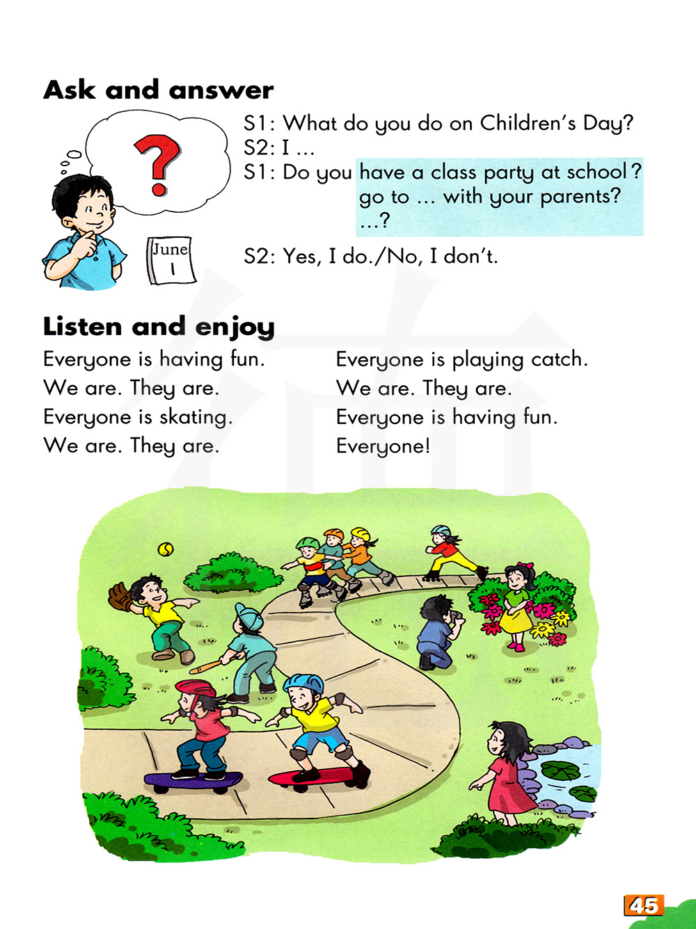 你在学校开班级派对吗?你和你的父母去……吗?你……吗?是的。/不。