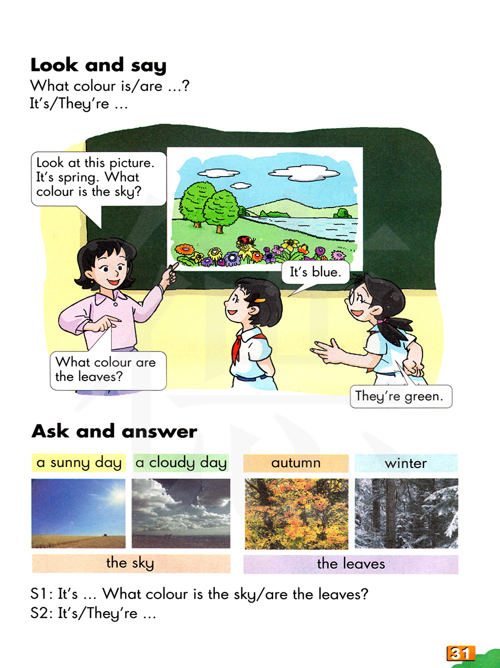 看这幅图片。这是春天。天空是什么颜色?