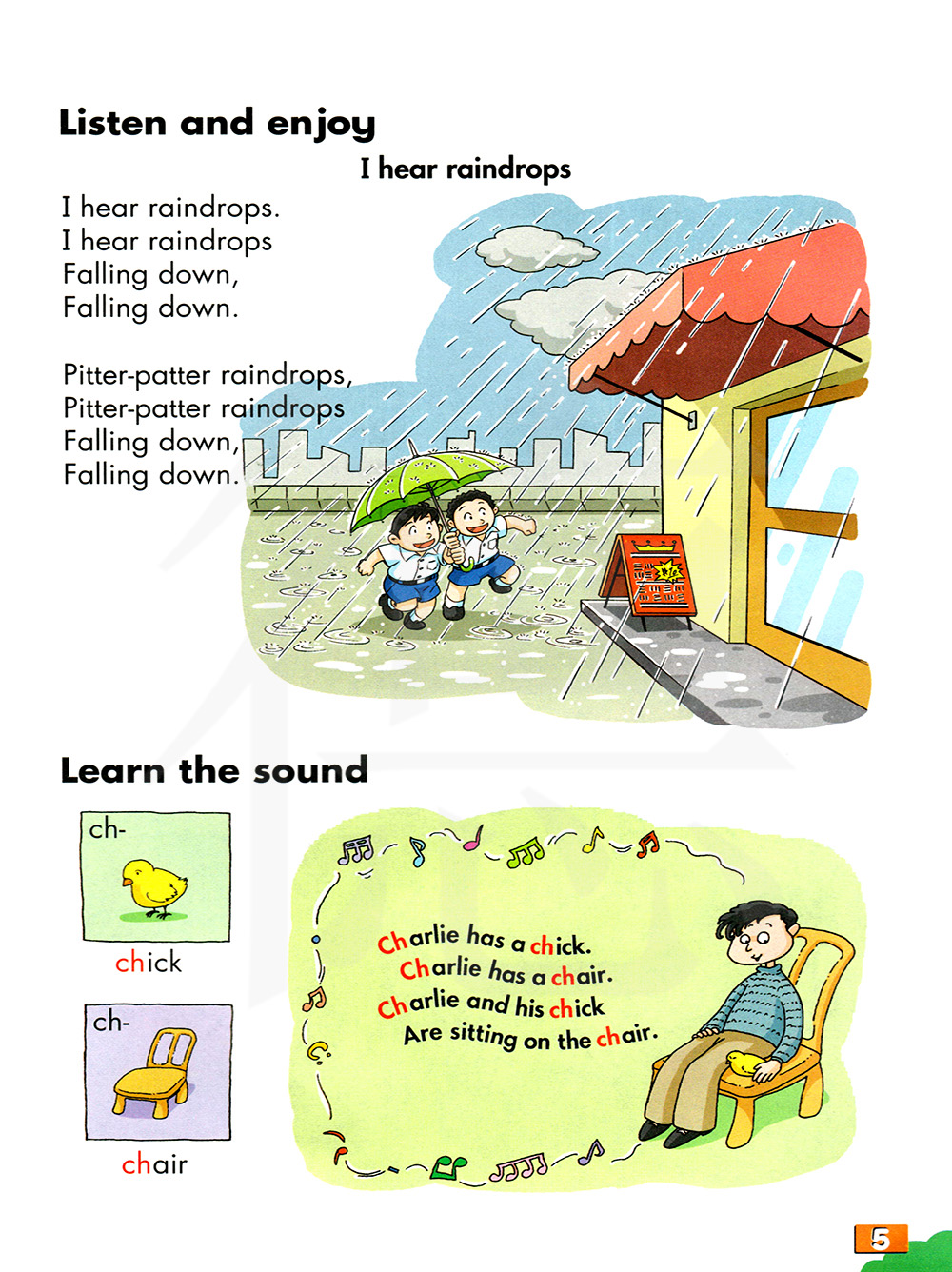 查理有一只小鸡。查理有一张椅子。查理和他的小鸡坐在椅子上。